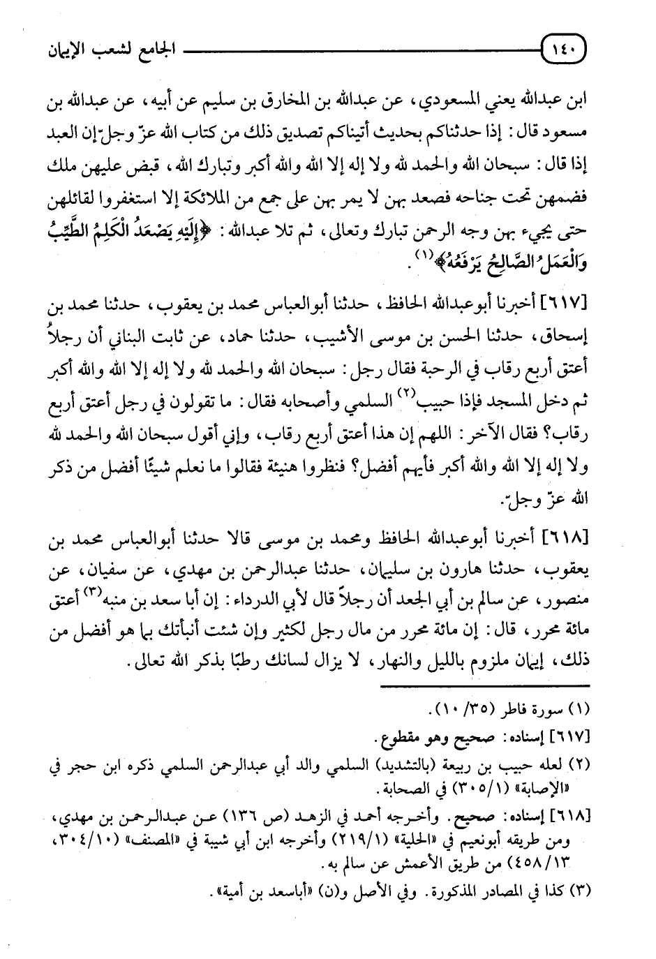 618 - أَخْبَرَنَا أَبُو عَبْدِ اللهِ الْحَافِظُ، وَمُحَمَّدُ بْنُ مُوسَى قَالَا: حدثنا أَبُو الْعَبَّاسِ مُحَمَّدُ بْنُ يَعْقُوبَ، حدثنا هَارُونُ بْنُ سُلَيْمَانَ، حدثنا عَبْدُ الرَّحْمَنِ بْنُ مَهْدِيٍّ، عَنْ سُفْيَانَ، عَنْ مَنْصُورٍ، عَنْ سَالِمِ بْنِ أَبِي الْجَعْدِ، أَنَّ رَجُلًا قَالَ لِأَبِي الدَّرْدَاءِ: إِنَّ أَبَا سَعْدِ بْنِ مُنَبِّهٍ أَعْتَقَ مِائَةَ مُحَرَّرٍ قَالَ: إِنَّ " §مِائَةَ مُحَرَّرٍ مِنْ مَالِ رَجُلٍ لَكَثِيرٌ، وَإِنْ شِئْتَ أَنْبَأْتُكَ بِمَا هُوَ أَفْضَلُ مِنْ ذَلِكَ إِيمَانٌ مَلْزُومٌ بِاللَّيْلِ، وَالنَّهَارِ لَا يَزَالُ لِسَانُكَ رَطْبًا بِذِكْرِ اللهِ تَعَالَى "