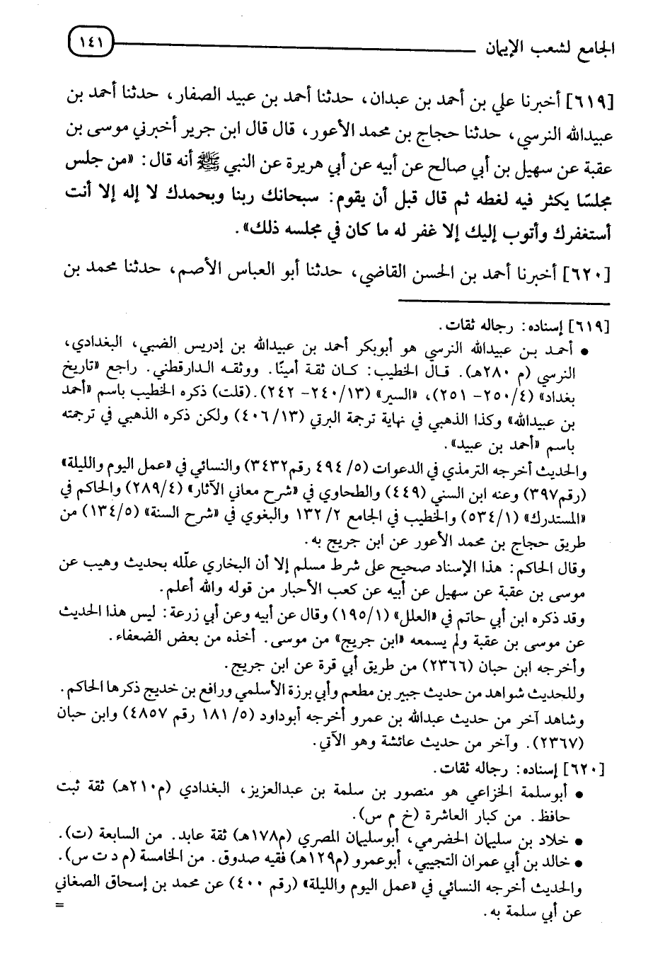 619 - أَخْبَرَنَا عَلِيُّ بْنُ أَحْمَدَ بْنِ عَبْدَانَ، حدثنا أَحْمَدُ بْنُ عُبَيْدِ بْنِ الصَّفَّارِ، حدثنا أَحْمَدُ بْنُ عُبَيْدِ اللهِ النَّرْسِيُّ، حدثنا حَجَّاجُ بْنُ مُحَمَّدٍ الْأَعْوَرُ قَالَ: قَالَ ابْنُ جُرَيْجٍ: أَخْبَرَنِي مُوسَى بْنُ عُقْبَةَ، عَنْ سُهَيْلِ بْنِ أَبِي صَالِحٍ، عَنْ أَبِيهِ، عَنْ أَبِي هُرَيْرَةَ، عَنِ النَّبِيِّ صَلَّى اللَّهُ عَلَيْهِ وَسَلَّمَ أنه قَالَ: §" مَنْ جَلَسَ مَجْلِسًا يَكْثُرُ فِيهِ لَغَطُهُ ثُمَّ قَالَ قَبْلَ أَنْ يَقُومَ: سُبْحَانَكَ رَبَّنَا وَبِحَمْدِكَ، لَا إِلَهَ إِلَّا أَنْتَ، أَسْتَغْفِرُكَ وَأَتُوبُ إِلَيْكَ، إِلَّا غُفِرَ لَهُ مَا كَانَ فِي مَجْلِسِهِ ذَلِكَ "