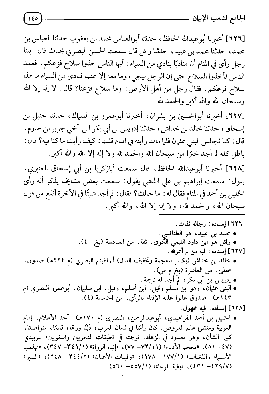 627 - أَخْبَرَنَا أَبُو الْحُسَيْنِ بْنُ بِشْرَانَ، أَخْبَرَنَا أَبُو عَمْرِو بْنُ السَّمَّاكِ، حدثنا حَنْبَلُ بْنُ إِسْحَاقَ، حدثنا خَالِدُ بْنُ خِدَاشٍ، حدثنا إِدْرِيسُ بْنُ أَبِي بَكْرِ ابْنُ أَخِي جَرِيرِ بْنِ حَازِمٍ قَالَ: كُنَّا نُجَالِسُ الْبَتِّيَّ عُثْمَانَ فَلَمَّا مَاتَ رَأَيْتُهُ فِي الْمَنَامِ قُلْتُ: كَيْفَ رَأَيْتَ مَا كُنَّا فِيهِ؟ قَالَ: " §بَاطِلٌ كُلُّهُ لَمْ أَجِدْ خَيْرًا مِنْ سُبْحَانَ اللهِ، وَالْحَمْدُ لِلَّهِ وَلَا إِلَهَ إِلَّا اللهُ وَاللهُ أَكْبَرُ "