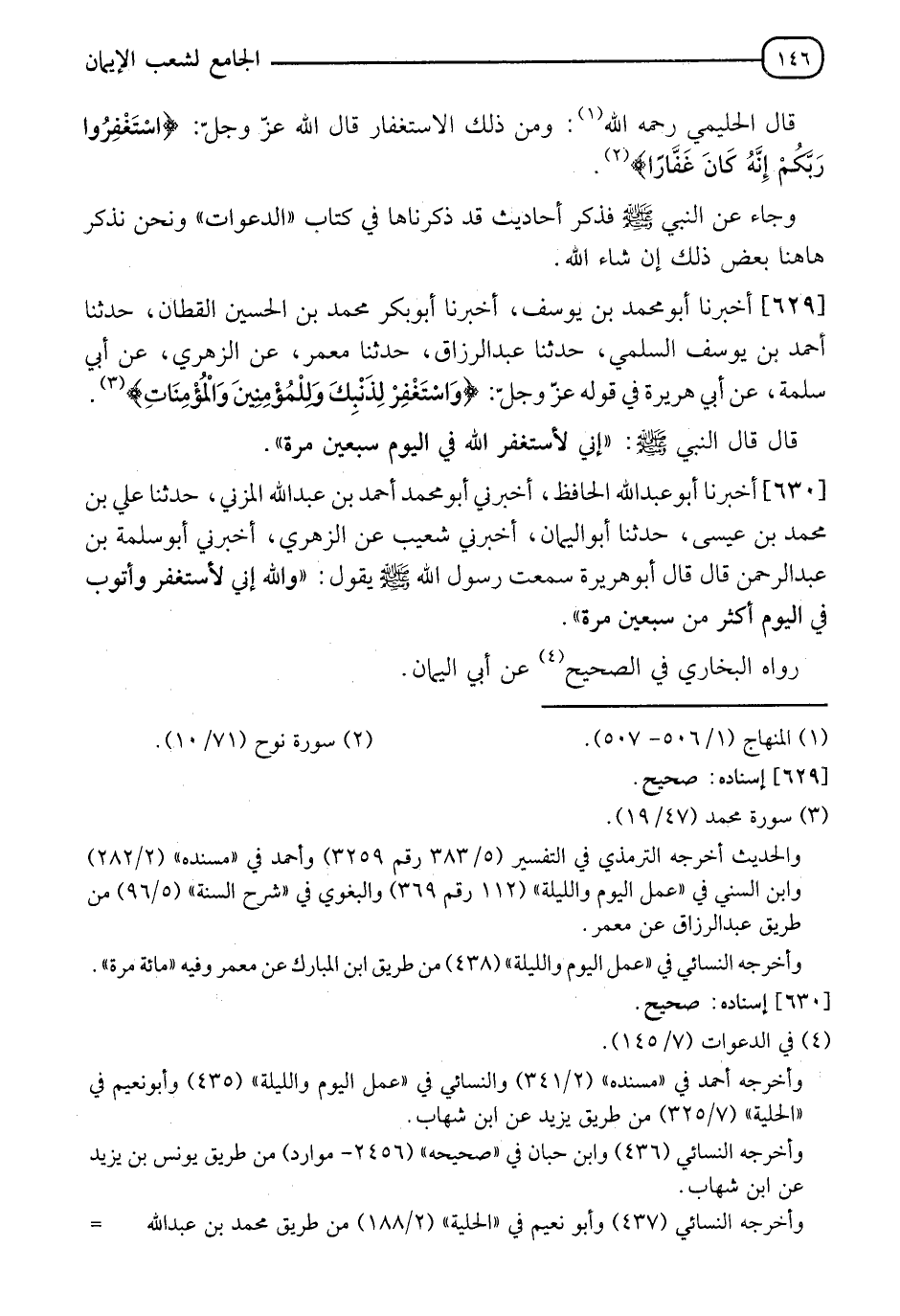 630 - أَخْبَرَنَا أَبُو عَبْدِ اللهِ الْحَافِظُ، أَخْبَرَنِي أَبُو مُحَمَّدٍ أَحْمَدُ بْنُ عَبْدِ اللهِ الْمُزَنِيُّ، حدثنا عَلِيُّ بْنُ مُحَمَّدِ بْنِ عِيسَى، حدثنا أَبُو الْيَمَانِ، أَخْبَرَنِي شُعَيْبٌ، عَنِ الزُّهْرِيِّ، أَخْبَرَنِي أَبُو سَلَمَةَ بْنُ عَبْدِ الرَّحْمَنِ قَالَ: قَالَ أَبُو هُرَيْرَةَ: سَمِعْتُ رَسُولَ اللهِ صَلَّى اللَّهُ عَلَيْهِ وَسَلَّمَ يَقُولُ: §" وَاللهِ إِنِّي لَأَسْتَغْفِرُ وَأَتُوبُ فِي الْيَوْمِ أَكْثَرَ مِنْ سَبْعِينَ مَرَّةً " رَوَاهُ الْبُخَارِيُّ فِي الصَّحِيحِ، عَنْ أَبِي الْيَمَانِ