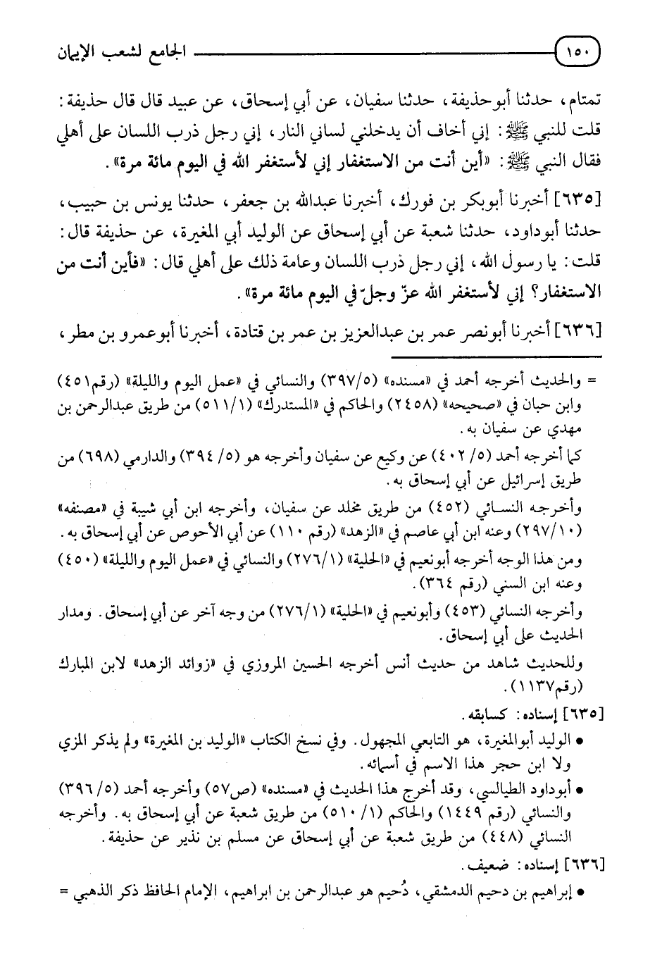 635 - أَخْبَرَنَا أَبُو بَكْرِ بْنُ فُورَكٍ، أَخْبَرَنَا عَبْدُ اللهِ بْنُ جَعْفَرٍ، حدثنا يُونُسُ بْنُ حَبِيبٍ، حدثنا أَبُو دَاوُدَ، حدثنا شُعْبَةُ، عَنْ أَبِي إِسْحَاقَ، عَنِ الْوَلِيدِ أَبِي الْمُغِيرَةِ، عَنْ حُذَيْفَةَ، قَالَ: قُلْتُ: يَا رَسُولَ اللهِ، إِنِّي رَجُلُ ذَرِبُ اللِّسَانِ، وَعَامَّةُ ذَلِكَ عَلَى أَهْلِي قَالَ: " §فَأَيْنَ أَنْتَ مِنَ الِاسْتِغْفَارِ، إِنِّي لَأَسْتَغْفِرُ اللهَ عَزَّ وَجَلَّ فِي الْيَوْمِ مِائَةَ مَرَّةٍ "