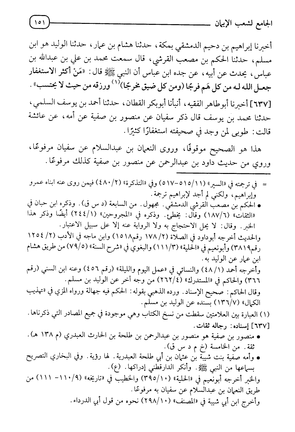 637 - أَخْبَرَنَا أَبُو طَاهِرٍ الْفَقِيهُ، أنبأنا أَبُو بَكْرٍ الْقَطَّانُ، حدثنا أَحْمَدُ بْنُ يُوسُفَ السُّلَمِيُّ، حدثنا مُحَمَّدُ بْنُ يُوسُفَ قَالَ: ذَكَرَ سُفْيَانُ، عَنْ مَنْصُورِ بْنِ صَفِيَّةَ، عَنْ أُمِّهِ، عَنْ عَائِشَةَ، قَالَتْ: §" طُوبَى لِمَنْ وَجَدَ فِي صَحِيفَتِهِ اسْتِغْفَارًا كَثِيرًا هَذَا هُوَ الصَّحِيحُ مَوْقُوفًا " وَرُوِيَ عَنِ النُّعْمَانِ بْنِ عَبْدِ السَّلَامِ، عَنْ سُفْيَانَ مَرْفُوعًا وَرُوِيَ مِنْ حَدِيثِ دَاوُدَ بْنِ عَبْدِ الرَّحْمَنِ، عَنْ مَنْصُورِ بْنِ صَفِيَّةَ كَذَلِكَ مَرْفُوعًا