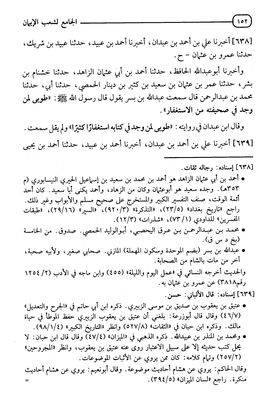 638 - أَخْبَرَنَا عَلِيُّ بْنُ أَحْمَدَ بْنِ عَبْدَانَ، أَخْبَرَنَا أَحْمَدُ بْنُ عُبَيْدٍ، حدثنا عُبَيْدُ بْنُ شَرِيكٍ، حدثنا عَمْرُو بْنُ عُثْمَانَ، ح وَأَخْبَرَنَا أَبُو عَبْدِ اللهِ الْحَافِظُ، حدثنا أَحْمَدُ بْنُ أَبِي عُثْمَانَ الزَّاهِدُ، حدثنا خُشْنَامُ بْنُ بِشْرٍ، حدثنا عَمْرُو بْنُ عُثْمَانَ بْنِ سَعِيدِ بْنِ كَثِيرِ بْنِ دِينَارٍ الْحِمْصِيُّ، حدثنا أَبِي، حدثنا مُحَمَّدُ بْنُ عَبْدِ الرَّحْمَنِ، قَالَ: سَمِعْتُ عَبْدَ اللهِ بْنَ بُسْرٍ يَقُولُ: قَالَ رَسُولُ اللهِ صَلَّى اللَّهُ عَلَيْهِ وَسَلَّمَ: §" طُوبَى لِمَنْ وَجَدَ فِي صَحِيفَتِهِ مِنَ الِاسْتِغْفَارِ وَقَالَ ابْنُ عَبْدَانَ فِي رِوَايَتِهِ: طُوبَى لِمَنْ وَجَدَ فِي كِتَابِهِ اسْتِغْفَارًا كَثِيرًا، وَلَمْ يَقُلْ سَمِعْتُ "