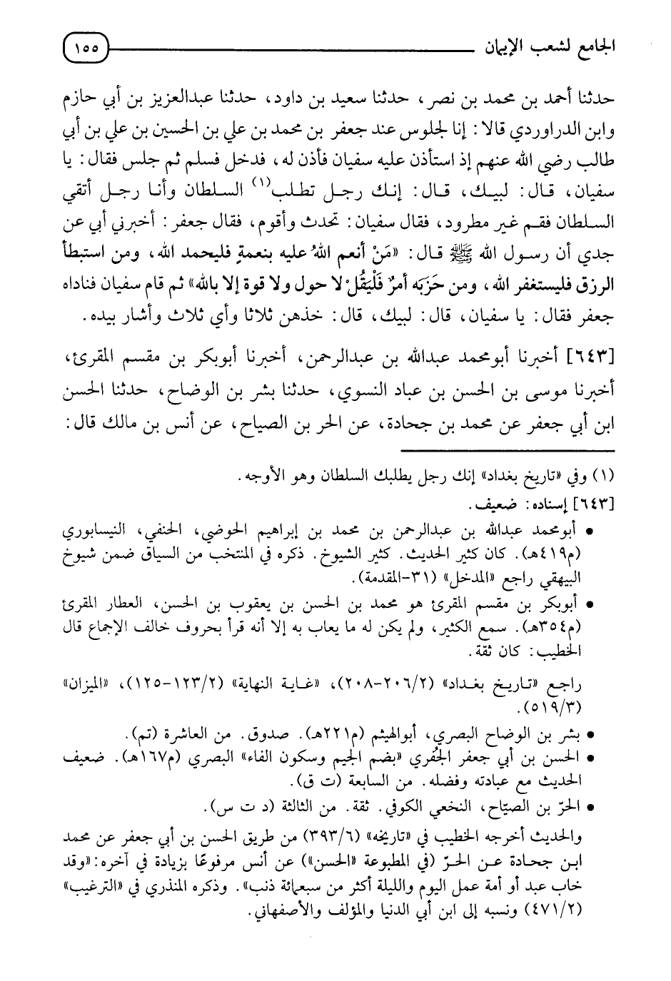 643 - أَخْبَرَنَا أَبُو مُحَمَّدٍ عَبْدُ اللهِ بْنُ عَبْدِ الرَّحْمَنِ، أَخْبَرَنَا أَبُو بَكْرِ بْنُ مِقْسَمٍ الْمُقْرِئُ، أَخْبَرَنَا مُوسَى بْنُ الْحَسَنِ بْنِ عَبَّادٍ النَّسَوِيُّ، حدثنا بِشْرُ بْنُ الْوَضَّاحِ، حدثنا الْحَسَنُ بْنُ أَبِي جَعْفَرٍ، عَنْ مُحَمَّدِ بْنِ جُحَادَةَ، عَنِ الْحُرِّ بْنِ الصَّيَّاحِ، عَنْ أَنَسِ بْنِ مَالِكٍ قَالَ: -[156]- كُنَّا مَعَ رَسُولِ اللهِ صَلَّى اللَّهُ عَلَيْهِ وَسَلَّمَ فِي مَسِيرةٍ فَقَالَ: " §اسْتَغْفِرُوا اللهَ " فَاسْتَغْفَرْنَا فَقَالَ: " أَتِمُّوهَا سَبْعِينَ مَرَّةً " قَالَ: فَأَتْمَمْنَاهَا فَقَالَ: " مَا مِنْ عَبْدٍ وَلَا أَمَةٍ اسْتَغْفَرَ اللهَ تَبَارَكَ وَتَعَالَى فِي يَوْمٍ سَبْعِينَ مَرَّةً إِلَّا غَفَرَ اللهُ لَهُ سَبْعَمِائَةِ ذَنْبٍ "