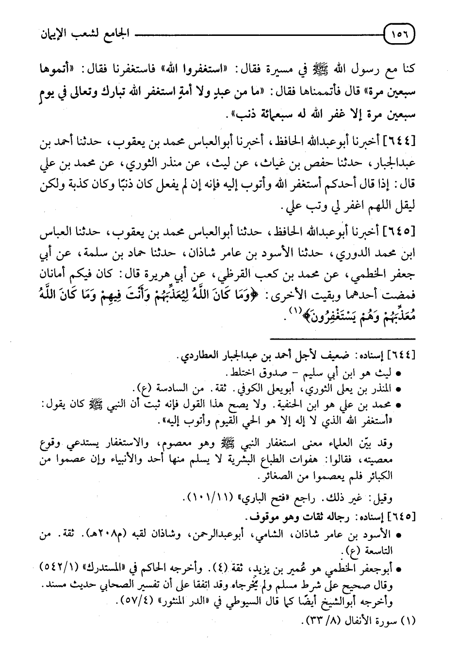 644 - أَخْبَرَنَا أَبُو عَبْدِ اللهِ الْحَافِظُ، أَخْبَرَنَا أَبُو الْعَبَّاسِ مُحَمَّدُ بْنُ يَعْقُوبَ، حدثنا أَحْمَدُ بْنُ عَبْدِ الْجَبَّارِ، حدثنا حَفْصُ بْنُ غِيَاثٍ، عَنْ لَيْثٍ، عَنْ مُنْذِرٍ الثَّوْرِيِّ، عَنْ مُحَمَّدِ بْنِ عَلِيٍّ قَالَ: إِذَا قَالَ أَحَدُكُمُ: " §أَسْتَغْفِرُ اللهَ، وَأَتُوبُ إِلَيْهِ فَإِنَّهُ إِنْ لَمْ يَفْعَلْ كَانَ ذَنْبًا، وَكَانَ كَذْبَةً ولَكِنْ لِيَقُلِ: اللهُمَّ اغْفِرْ لِي وَتُبْ عَلَيَّ "