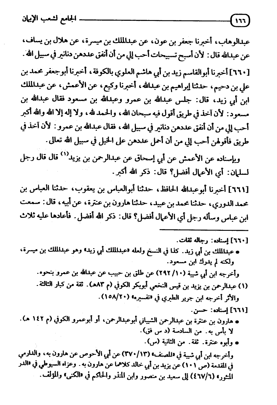 660 - أَخْبَرَنَا أَبُو الْقَاسِمِ زَيْدُ بْنُ أَبِي هَاشِمٍ الْعَلَوِيُّ بِالْكُوفَةِ أَخْبَرَنَا أَبُو جَعْفَرٍمُحَمَّدُ بْنُ عَلِيِّ بْنِ دُحَيْمٍ، حدثنا إِبْرَاهِيمُ بْنُ عَبْدِ اللهِ، أَخْبَرَنَا وَكِيعٌ، عَنِ الْأَعْمَشِ، عَنْ عَبْدِ الْمَلِكِ بْنِ أَبِي زَيْدٍ قَالَ: جَلَسَ عَبْدُ اللهِ بْنُ عَمْرٍو وَعَبْدُ اللهِ بْنُ مَسْعُودٍ فَقَالَ عَبْدُ اللهِ بْنُ مَسْعُودٍ: لَأَنْ آخُذَ فِي طَرِيقٍ أَقُولَ: فِيهِ §" سُبْحَانَ اللهِ وَالْحَمْدُ لِلَّهِ وَلَا إِلَهَ إِلَّا اللهُ وَاللهُ أَكْبَرُ أَحَبُّ إِلَيَّ مِنْ أَنْ أُنْفِقَ عَدَدَهُنَّ دَنَانِيرَ فِي سَبِيلِ اللهِ فَقَالَ عَبْدُ اللهِ بْنُ عَمْرٍو: لَأَنْ آخُذَ فِي طَرِيقٍ فَأَقُولَهُنَّ أَحَبُّ إِلَيَّ مِنْ أَنْ أَحْمِلَ عَدَدَهُنَّ عَلَى الْخَيْلِ فِي سَبِيلِ اللهِ تَعَالَى "