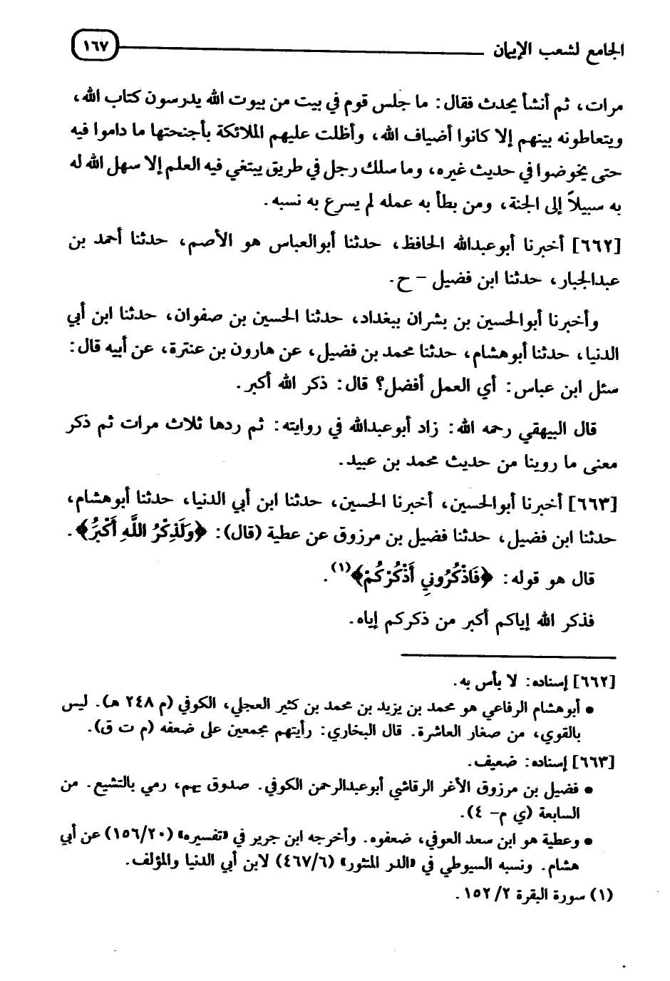 662 - أَخْبَرَنَا أَبُو عَبْدِ اللهِ الْحَافِظُ، حدثنا أَبُو الْعَبَّاسِ هُوَ الْأَصَمُّ، حدثنا أَحْمَدُ بْنُ عَبْدِ الْجَبَّارِ، حدثنا ابْنُ فُضَيْلٍ، ح وأَخْبَرَنَا أَبُو الْحُسَيْنِ بْنُ بِشْرَانَ، بِبَغْدَادَ، حدثنا الْحُسَيْنُ بْنُ صَفْوَانَ، حدثنا ابْنُ أَبِي الدُّنْيَا، حدثنا أَبُو هِشَامٍ، حدثنا مُحَمَّدُ بْنُ فُضَيْلٍ، عَنْ هَارُونَ بْنِ عَنْتَرَةَ، عَنْ أَبِيهِ، قَالَ: سُئِلَ ابْنُ عَبَّاسٍ أَيُّ الْعَمَلِ أَفْضَلُ؟ قَالَ: " §ذِكْرُ اللهِ أَكْبَرُ " قَالَ الْبَيْهَقِيُّ رَحِمَهُ اللهُ: زَادَ أَبُو عَبْدِ اللهِ فِي رِوَايَتِهِ ثُمَّ رَدَّهَا ثَلَاثَ مَرَّاتٍ ثُمَّ ذَكَرَ مَعْنَى مَا رُوِّينَا مِنْ حَدِيثِ مُحَمَّدِ بْنِ عُبَيْدٍ