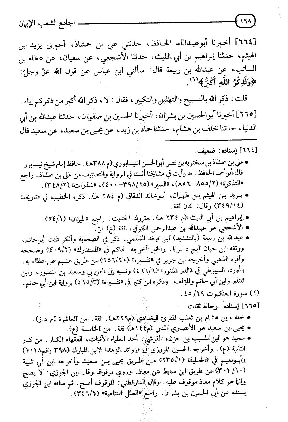 664 - أَخْبَرَنَا أَبُو عَبْدِ اللهِ الْحَافِظُ، حَدَّثَنِي عَلِيُّ بْنُ حَمْشَاذ، أَخْبَرَنِي يَزِيدُ بْنُ الْهَيْثَمِ، حدثنا إِبْرَاهِيمُ بْنُ أَبِي اللَّيْثِ، حدثنا الْأَشْجَعِيُّ، عَنْ سُفْيَانَ، عَنْ عَطَاءِ بْنِ السَّائِبِ، عَنْ عَبْدِ اللهِ بْنِ رَبِيعَةَ قَالَ: سَأَلَنِي ابْنُ عَبَّاسٍ، عَنْ قَوْلِ اللهِ عَزَّ وَجَلَّ {وَلَذِكْرُ اللهِ أَكْبَرُ} [العنكبوت: 45] قُلْتُ: ذِكْرُ اللهِ بِالتَّسْبِيحِ وَالتَّهْلِيلِ وَالتَّكْبِيرِ فَقَالَ: " §لَا، ذِكْرُ اللهِ أَكْبَرُ مِنْ ذِكْرِكُمْ إِيَّاهُ "