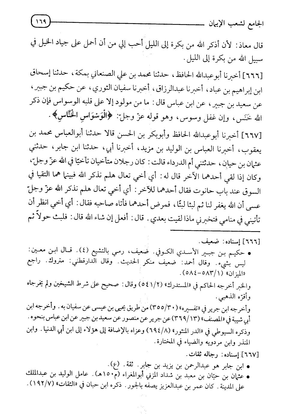666 - أَخْبَرَنَا أَبُو عَبْدِ اللهِ الْحَافِظُ، حدثنا مُحَمَّدُ بْنُ عَلِيٍّ الصَّنْعَانِيُّ، بِمَكَّةَ، حدثنا إِسْحَاقُ بْنُ إِبْرَاهِيمَ بْنِ عَبَّادٍ، أَخْبَرَنَا عَبْدُ الرَّزَّاقِ، أَخْبَرَنَا سُفْيَانُ الثَّوْرِيُّ، عَنْ حَكِيمِ بْنِ جُبَيْرٍ، عَنْ سَعِيدِ بْنِ جُبَيْرٍ، عَنِ ابْنِ عَبَّاسٍ قَالَ: §" مَا مِنْ مَوْلُودٍ إِلَّا عَلَى قَلْبِهِ الْوَسْوَاسُ فَإِنْ ذَكَرَ اللهَ خَنَسَ، وَإِنْ غَفَلَ وَسْوَسَ وَهُوَ قَوْلُهُ عَزَّ وَجَلَّ {الْوَسْوَاسِ الْخَنَّاسِ} [الناس: 4] "