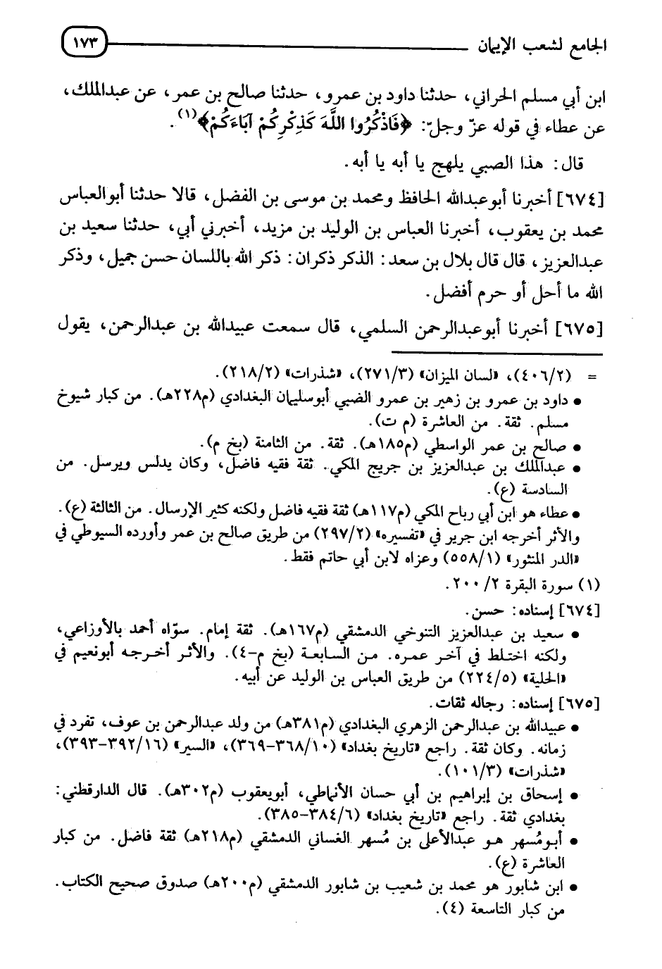 674 - أَخْبَرَنَا أَبُو عَبْدِ اللهِ الْحَافِظُ، وَمُحَمَّدُ بْنُ مُوسَى بْنِ الْفَضْلِ، قَالَا: حدثنا أَبُو الْعَبَّاسِ مُحَمَّدُ بْنُ يَعْقُوبَ، أَخْبَرَنَا الْعَبَّاسُ بْنُ الْوَلِيدِ بْنِ مَزْيَدَ، أَخْبَرَنِي أَبِي، حدثنا سَعِيدُ بْنُ عَبْدِ الْعَزِيزِ قَالَ: قَالَ بِلَالُ بْنُ سَعْدٍ: " §الذِّكْرُ ذِكْرَانِ ذِكْرُ اللهِ بِاللِّسَانِ حَسَنٌ جَمِيلٌ، وَذِكْرُ اللهِ عِنْدَ مَا أَحَلَّ أَوْ حَرَّمَ أَفْضَلُ "