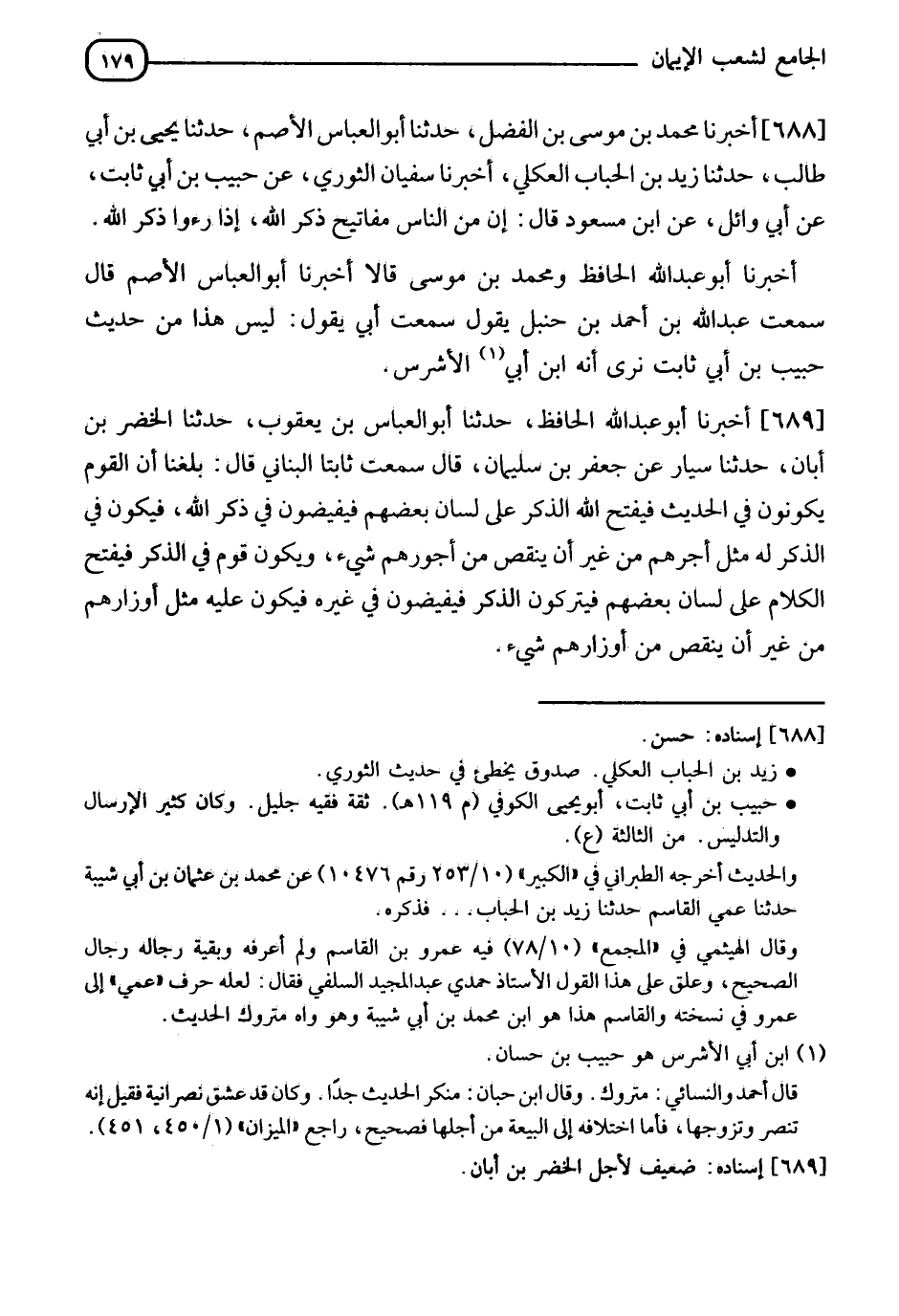 688 - أَخْبَرَنَا مُحَمَّدُ بْنُ مُوسَى بْنِ الْفَضْلِ، حدثنا أَبُو الْعَبَّاسِ الْأَصَمُّ، حدثنا يَحْيَى بْنُ أَبِي طَالِبٍ، حدثنا زَيْدُ بْنُ الْحُبَابِ الْعُكْلِيُّ، أَخْبَرَنَا سُفْيَانُ الثَّوْرِيُّ، عَنْ حَبِيبِ بْنِ أَبِي ثَابِتٍ، عَنْ أَبِي وَائِلٍ، عَنِ ابْنِ مَسْعُودٍ، قَالَ: إِنَّ §" مِنَ النَّاسِ مَفَاتِيحَ ذِكْرِ اللهِ إِذَا رُؤوا ذُكِرَ اللهُ "