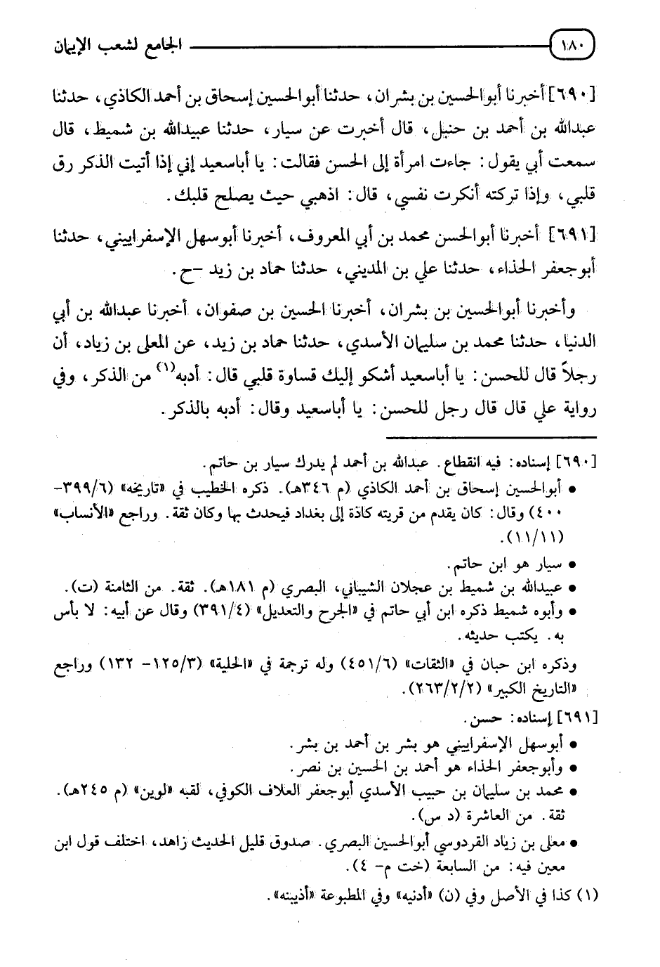 691 - أَخْبَرَنَا أَبُو الْحَسَنِ مُحَمَّدُ بْنُ أَبِي الْمَعْرُوفِ، أَخْبَرَنَا أَبُو سَهْلٍ الْإِسْفَرَايِينِيُّ، حدثنا أَبُو جَعْفَرٍ الْحَذَّاءُ، حدثنا عَلِيُّ بْنُ الْمَدِينِيِّ، حدثنا حَمَّادُ بْنُ زَيْدٍ، ح وَأَخْبَرَنَا أَبُو الْحُسَيْنِ بْنُ بِشْرَانَ، أَخْبَرَنَا الْحُسَيْنُ بْنُ صَفْوَانَ، أَخْبَرَنَا عَبْدُ اللهِ بْنُ أَبِي الدُّنْيَا، حدثنا مُحَمَّدُ بْنُ سُلَيْمَانَ الْأَسَدِيُّ، حدثنا حَمَّادُ بْنُ زَيْدٍ، عَنِ الْمُعَلَّى بْنِ زِيَادٍ، أَنَّ رَجُلًا قَالَ لِلْحَسَنِ: " §يَا أَبَا سَعِيدٍ، أَشْكُو إِلَيْكَ قَسَاوَةَ قَلْبِي قَالَ: أَدِّبْهُ مِنَ الذِّكْرِ " وَفِي رِوَايَةِ عَلِيٍّ قَالَ: قَالَ رَجُلٌ لِلْحَسَنِ: يَا أَبَا سَعِيدٍ وَقَالَ: أَدِّبْهُ بِالذِّكْرِ