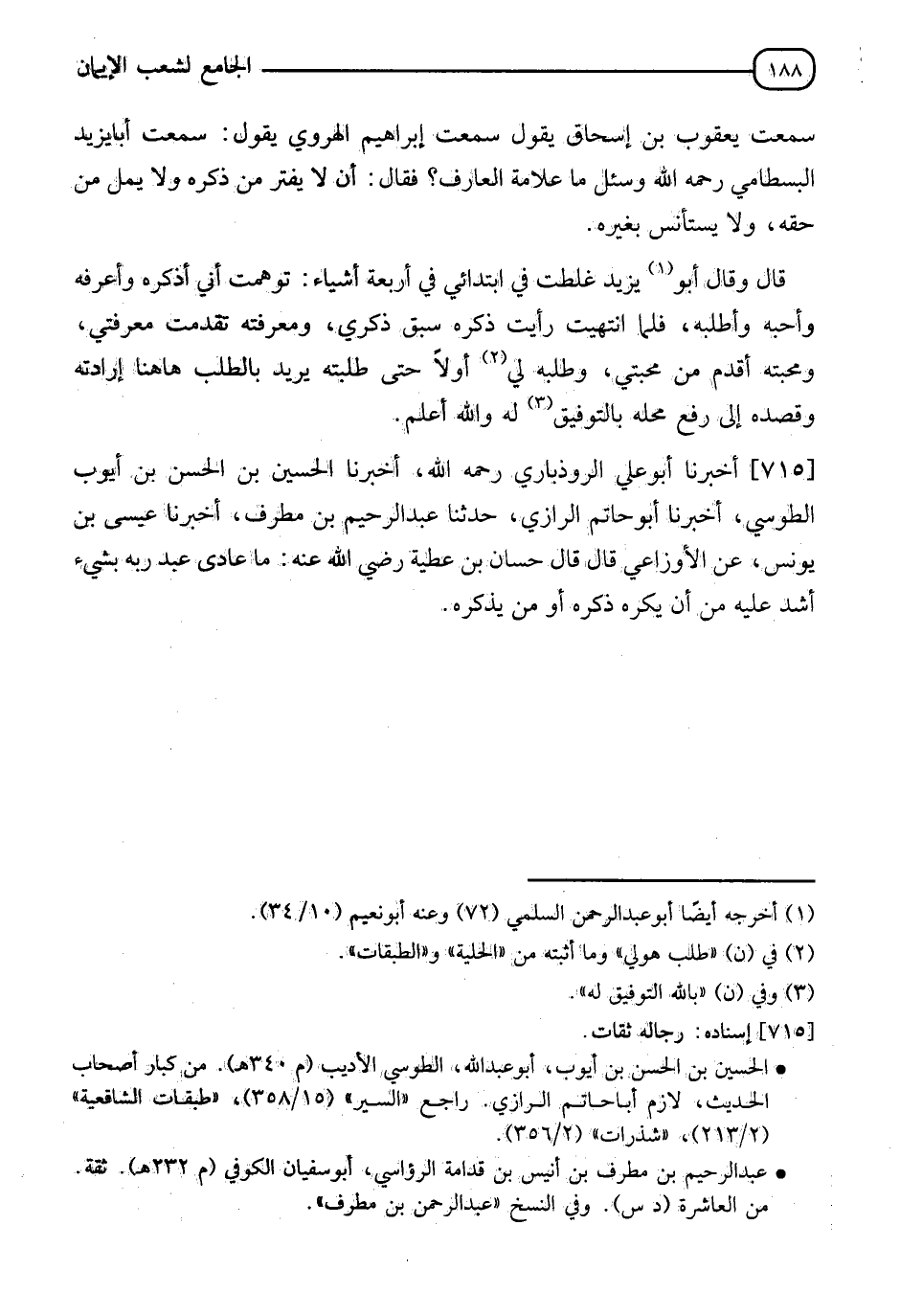 715 - أَخْبَرَنَا أَبُو عَلِيٍّ الرُّوذْبَارِيُّ، رَحِمَهُ اللهُ أَخْبَرَنَا الْحُسَيْنُ بْنُ الْحَسَنِ بْنِ أَيُّوبَ الطُّوسِيُّ، أَخْبَرَنَا أَبُو حَاتِمٍ الرَّازِيُّ، حدثنا عَبْدُ الرَّحِيمِ بْنُ مُطَرِّفٍ، أَخْبَرَنَا عِيسَى بْنُ يُونُسَ، عَنِ الْأَوْزَاعِيِّ قَالَ: قَالَ حَسَّانُ بْنُ عَطِيَّةَ رَضِيَ اللهُ عَنْهُ: §" مَا عَادَى عَبْدٌ رَبَّهُ بِشَيْءٍ أَشَدَّ عَلَيْهِ مِنْ أَنْ يَكْرَهَ ذِكْرَهُ أَوْ مَنْ يذْكُرُهُ "