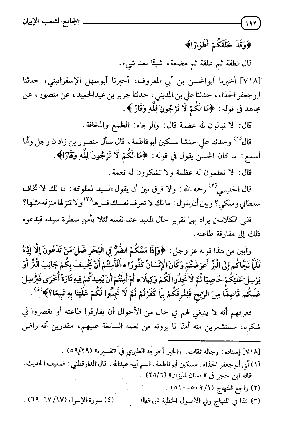 قَالَ: وَحَدَّثَنَا عَلِيٌّ، حَدَّثَنَا مِسْكِينٌ أَبُو فَاطِمَةَ قَالَ: سَأَلَ مَنْصُورَ بْنَ زَاذَانَ رَجُلٌ وَأَنَا أَسْمَعُ مَا كَانَ الْحَسَنُ يَقُولُ فِي قَوْلِهِ: {مَا لَكُمْ لَا تَرْجُونَ لِلَّهِ وَقَارًا} [نوح: 13] قَالَ: " §لَا تَعْلَمُونَ لَهُ عَظَمَةً، وَلَا تَشْكُرُونَ لَهُ نِعْمَةً " قَالَ الْحَلِيمِيُّ رَحِمَهُ اللهُ: ولَا فَرْقَ بَيْنَ أَنْ يَقُولَ السَّيِّدُ لِمَمْلُوكِهِ: مَا لَكَ لَا تَخَافُ سُلْطَانِي وَمُلْكِي وَبَيْنَ أَنْ يَقُولَ: مَا لَكَ لَا تُعَرِّفُ نَفْسَكَ قدرها، وَلَا تُنْزِلُهَا مَنْزِلَةَ مِثْلِهَا، فَفِي الْكَلَامَيْنِ يُرَادُ بِهِمَا تَقْرِيرُ حَالِ الْعَبْدِ عِنْدَ نَفْسِهِ لِئَلَّا يَأْمَنَ سَطْوَةَ سَيِّدِهِ فَيَدْعُوهُ ذَلِكَ إِلَى مُفَارَقَةِ طَاعَتِهِ، وَأَبَيْنَ مِنْ هَذَا قَوْلُهُ عَزَّ وَجَلَّ: {وَإِذَا مَسَّكُمُ الضُّرُّ فِي الْبَحْرِ ضَلَّ مَنْ تَدْعُونَ إِلَّا إِيَّاهُ فَلَمَّا نَجَّاكُمْ إِلَى الْبَرِّ أَعْرَضْتُمْ، وَكَانَ الْإِنْسَانُ كَفُورًا أَفَأَمِنْتُمْ أَنْ يَخْسِفَ بِكُمْ جَانِبَ الْبَرِّ، أَوْ يُرْسِلَ عَلَيْكُمْ حَاصِبًا ثُمَّ لَا تَجِدُوا لَكُمْ وَكِيلًا، أَمْ آمِنْتُمْ أَنْ يُعِيدَكُمْ فِيهِ تَارَةً أُخْرَى فَيُرْسِلَ عَلَيْكُمْ قَاصِفًا مِنَ الرِّيحِ فَيُغْرِقَكُمْ بِمَا كَفَرْتُمْ، ثُمَّ لَا تَجِدُوا لَكُمْ عَلَيْنَا بِهِ تَبِيعًا}، فَعَرَّفَهُمُ أَنَّهُ لَا يَنْبَغِي لَهُمْ فِي حَالٍ مِنَ الْأَحْوَالِ أَنْ يُفَارِقُوا طَاعَتَهُ، أَوْ يُقَصِّرُوا فِي شُكْرِهِ مُسْتَشْعِرِينَ مِنْهُ أَمْنًا لِمَا يَرَوْنَهُ مِنْ نِعَمِهِ السَّابِغَةِ عَلَيْهِمْ مُقَدِّرِينَ أَنَّهُ رَاضٍ