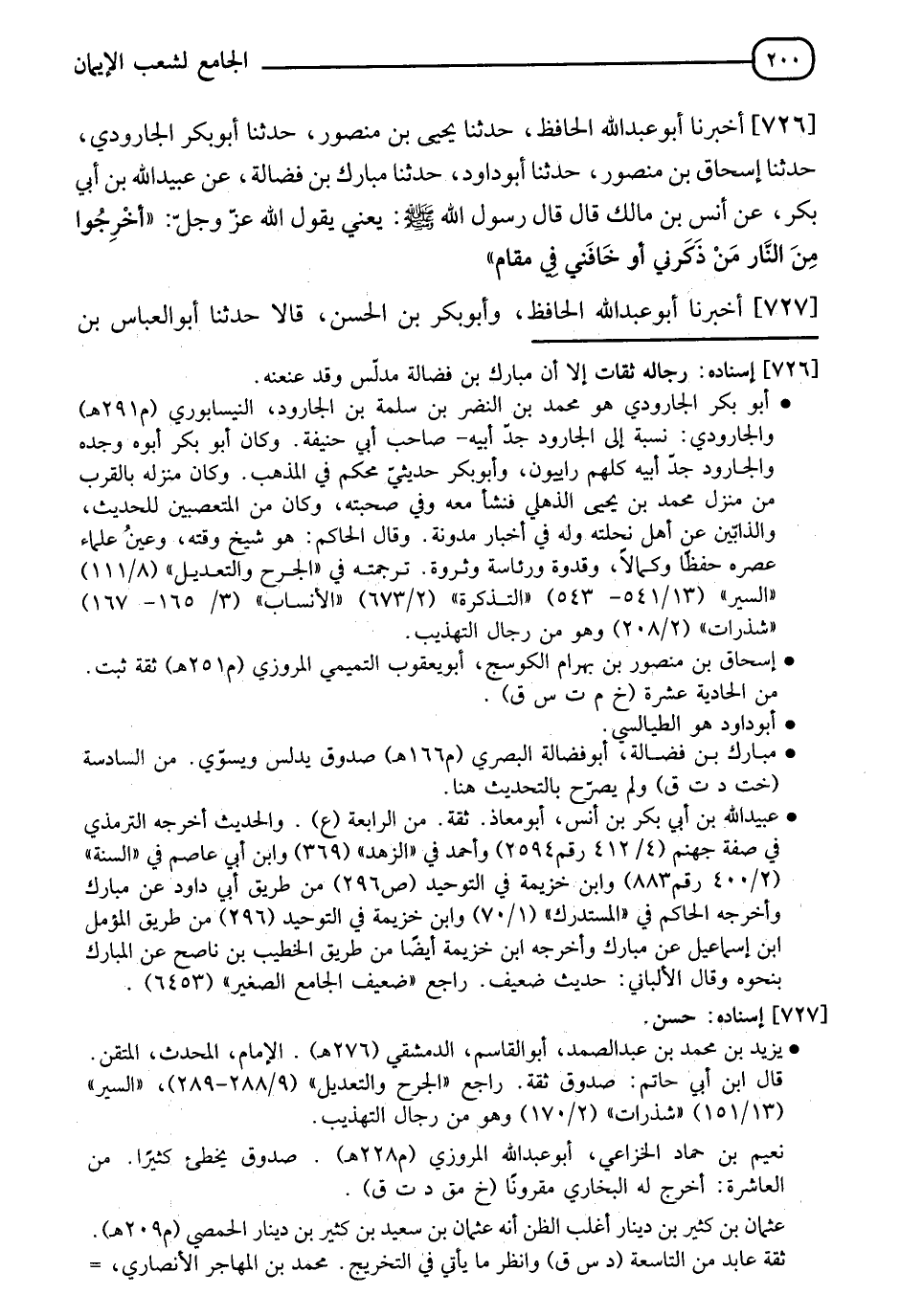 726 - أَخْبَرَنَا أَبُو عَبْدِ اللهِ الْحَافِظُ، حَدَّثَنَا يَحْيَى بْنُ مَنْصُورٍ، حَدَّثَنَا أَبُو بَكْرٍ الْجَارُودِيُّ، حَدَّثَنَا إِسْحَاقُ بْنُ مَنْصُورٍ، حَدَّثَنَا أَبُو دَاوُدَ، حَدَّثَنَا مُبَارَكُ بْنُ فَضَالَةَ، عَنْ عُبَيْدِ اللهِ بْنِ أَبِي بَكْرٍ، عَنْ أَنَسِ بْنِ مَالِكٍ قَالَ: قَالَ رَسُولُ اللهِ صَلَّى اللَّهُ عَلَيْهِ وَسَلَّمَ: يَعْنِي يَقُولُ اللهُ عَزَّ وَجَلَّ " §أَخْرِجُوا مِنَ النَّارِ مَنْ ذَكَرَنِي، أَوْ خَافَنِي فِي مَقَامٍ "