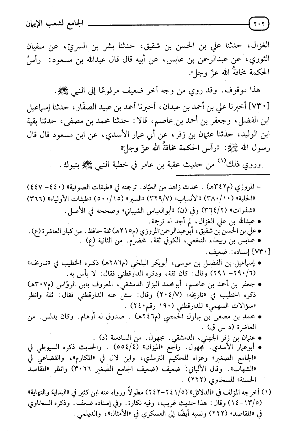 730 - أَخْبَرَنَا عَلِيُّ بْنُ أَحْمَدَ بْنِ عَبْدَانَ، أَخْبَرَنَا أَحْمَدُ بْنُ عُبَيْدٍ الصَّفَّارُ، حَدَّثَنَا إِسْمَاعِيلُ بْنُ الْفَضْلِ، وَجَعْفَرُ بْنُ أَحْمَدَ بْنِ عَاصِمٍ قَالَا: حَدَّثَنَا مُحَمَّدُ بْنُ مُصَفَّى، حَدَّثَنَا بَقِيَّةُ بْنُ الْوَلِيدِ، حَدَّثَنَا عُثْمَانُ بْنُ زُفَرَ، عَنْ أَبِي عَمَّارٍ الْأَسَدِيِّ، عَنِ ابْنِ مَسْعُودٍ قَالَ: قَالَ رَسُولُ اللهِ صَلَّى اللَّهُ عَلَيْهِ وَسَلَّمَ: §" رَأْسُ الْحِكْمَةِ مَخَافَةُ اللهِ عَزَّ وَجَلَّ " وَرُوِيَ ذَلِكَ مِنْ حَدِيثِ عُقْبَةَ بْنِ عَامِرٍ فِي خِطْبَةِ النَّبِيِّ صَلَّى اللَّهُ عَلَيْهِ وَسَلَّمَ بِتَبُوكَ