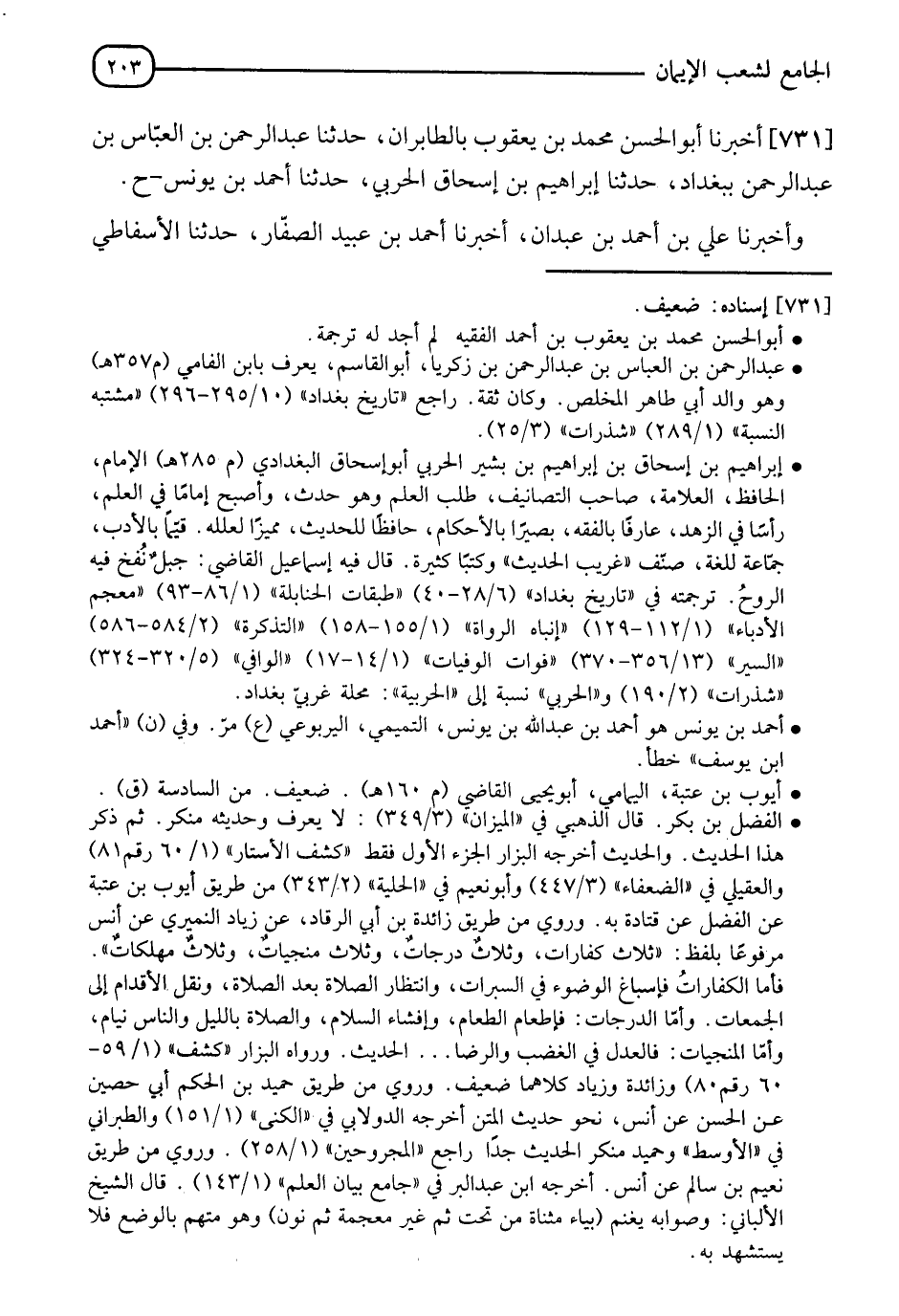 731 - أَخْبَرَنَا أَبُو الْحَسَنِ مُحَمَّدُ بْنُ يَعْقُوبَ بِالطَّابِرَانِ، حَدَّثَنَا عَبْدُ الرَّحْمَنِ بْنُ الْعَبَّاسِ بْنِ عَبْدِ الرَّحْمَنِ، بِبَغْدَادَ، حَدَّثَنَا إِبْرَاهِيمُ بْنُ إِسْحَاقَ الْحَرْبِيُّ، حَدَّثَنَا أَحْمَدُ بْنُ يُونُسَ، ح وَأَخْبَرَنَا عَلِيُّ بْنُ أَحْمَدَ بْنِ عَبْدَانَ، أَخْبَرَنَا أَحْمَدُ بْنُ عُبَيْدٍ الصَّفَّارُ، حَدَّثَنَا الْأَسْفَاطِيُّ -[204]- يَعْنِي الْعَبَّاسَ بْنَ الْفَضْلِ، حَدَّثَنَا أَحْمَدُ بْنُ يُونُسَ، حَدَّثَنَا أَيُّوبُ بْنُ عُتْبَةَ، عَنِ الْفَضْلِ بْنِ بَكْرٍ، عَنْ قَتَادَةَ، عَنْ أَنَسٍ قَالَ: قَالَ رَسُولُ اللهِ صَلَّى اللَّهُ عَلَيْهِ وَسَلَّمَ: " §ثَلَاثٌ مُهْلِكَاتٌ شُحٌّ مُطَاعٌ وَهَوًى مُتَّبَعٌ وَإِعْجَابُ الْمَرْءِ بِنَفْسِهِ، وَثَلَاثٌ مُنْجِيَاتٌ خَشْيَةُ اللهِ فِي السِّرِّ وَالْعَلَانِيَةِ، وَالْقَصْدَ فِي الْغِنَى وَالْفَقْرِ، وَكَلِمَةُ الْحَقِّ فِي الرِّضَا وَالْغَضَبِ " وَرُوِيَ ذَلِكَ مِنْ وَجْهٍ آخَرَ، عَنْ أَبِي هُرَيْرَةَ مَرْفُوعًا