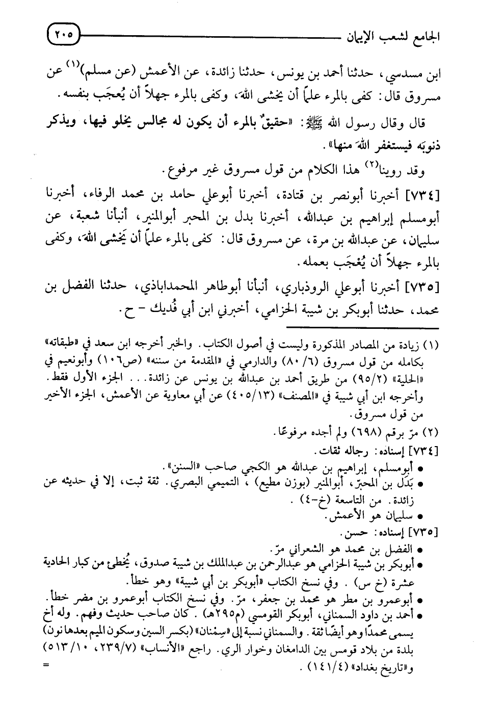 734 - أَخْبَرَنَا أَبُو نَصْرِ بْنُ قَتَادَةَ، أَخْبَرَنَا أَبُو عَلِيٍّ حَامِدُ بْنُ مُحَمَّدِ الرَّفَّاءُ، أَخْبَرَنَا أَبُو مُسْلِمٍ إِبْرَاهِيمُ بْنُ عَبْدِ اللهِ، أَخْبَرَنَا بَدَلُ بْنُ الْمُحَبَّرِ أَبُو الْمُنِيرِ، أَنْبَأَنَا شُعْبَةُ، عَنْ سُلَيْمَانَ، عَنْ عَبْدِ اللهِ بْنِ مُرَّةَ، عَنْ مَسْرُوقٍ قَالَ: " §كَفَى بِالْمَرْءِ عِلْمًا أَنْ يَخْشَى اللهَ، وَكَفَى بِالْمَرْءِ جَهْلًا أَنْ يُعْجَبَ بِعَمَلِهِ "