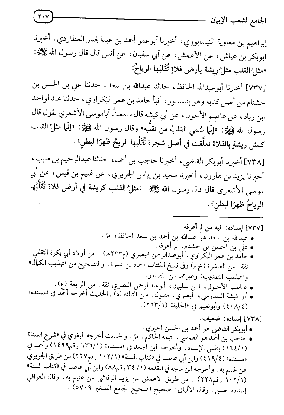 738 - أَخْبَرَنَا أَبُو بَكْرٍ الْقَاضِي، أَخْبَرَنَا حَاجِبُ بْنُ أَحْمَدَ، حَدَّثَنَا عَبْدُ الرَّحِيمِ بْنُ مُنِيبٍ، أَخْبَرَنَا يَزِيدُ بْنُ هَارُونَ، أَخْبَرَنَا سَعِيدُ بْنُ إِيَاسٍ الْجُرَيْرِيُّ، عَنْ غُنَيْمِ بْنِ قَيْسٍ، عَنْ أَبِي مُوسَى الْأَشْعَرِيِّ قَالَ: قَالَ رَسُولُ اللهِ صَلَّى اللَّهُ عَلَيْهِ وَسَلَّمَ: §" مَثَلُ الْقَلْبِ كَرِيشَةٍ فِي أَرْضٍ فَلَاةٍ تُقَلِّبُهَا الرِّيَاحُ ظَهْرًا لِبَطْنٍ "