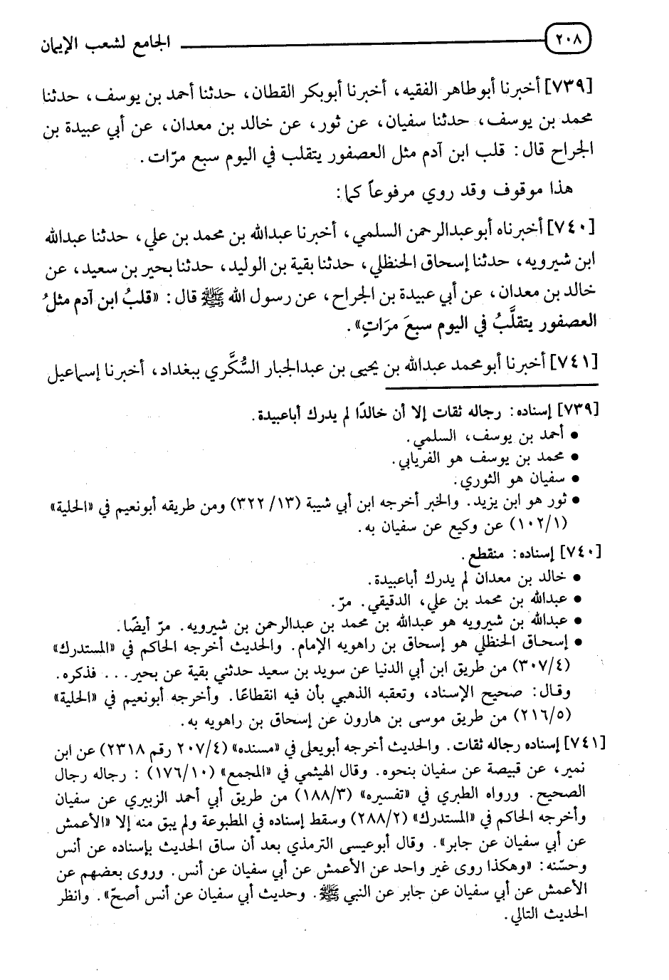 739 - أَخْبَرَنَا أَبُو طَاهِرٍ الْفَقِيهُ، أَخْبَرَنَا أَبُو بَكْرٍ الْقَطَّانُ، حَدَّثَنَا أَحْمَدُ بْنُ يُوسُفَ، حَدَّثَنَا مُحَمَّدُ بْنُ يُوسُفَ، حَدَّثَنَا سُفْيَانُ، عَنْ ثَوْرٍ، عَنْ خَالِدِ بْنِ مَعْدَانَ، عَنْ أَبِي عُبَيْدَةَ بْنِ الْجَرَّاحِ قَالَ: §" قَلْبُ ابْنِ آدَمَ مَثَلُ الْعُصْفُورِ يَتَقَلَّبُ فِي الْيَوْمِ سَبْعَ مَرَّاتٍ " هَذَا مَوْقُوفٌ وَقَدْ رُوِيَ مَرْفُوعًا كَمَا