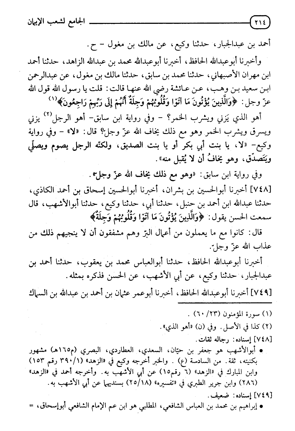 748 - أَخْبَرَنَا أَبُو الْحُسَيْنِ بْنُ بِشْرَانَ، أَخْبَرَنَا أَبُو الْحُسَيْنِ إِسْحَاقُ بْنُ أَحْمَدَ الْكَاذِيُّ، حَدَّثَنَا عَبْدُ اللهِ بْنُ أَحْمَدَ بْنِ حَنْبَلٍ، حَدَّثَنَا أَبِي، حَدَّثَنَا وَكِيعٌ، حَدَّثَنَا أَبُو الْأَشْهَبِ قَالَ: سَمِعْتُ الْحَسَنَ يَقُولُ: " {§وَالَّذِينَ يُؤْتُونَ مَا آتَوْا وَقُلُوبُهُمْ وَجِلَةٌ} [المؤمنون: 60] قَالَ: كَانُوا مَا يَعْلَمُونَ مِنْ أَعْمَالِ الْبِرِّ وَهُمْ مُشْفِقُونَ أَنْ لَا يُنْجِيَهُمْ ذَلِكَ مِنْ عَذَابِ اللهِ عَزَّ وَجَلَّ " أَخْبَرَنَا أَبُو عَبْدِ اللهِ الْحَافِظُ، حَدَّثَنَا أَبُو الْعَبَّاسِ مُحَمَّدُ بْنُ يَعْقُوبَ، حَدَّثَنَا أَحْمَدُ بْنُ عَبْدِ الْجَبَّارِ، حَدَّثَنَا وَكِيعٌ، عَنْ أَبِي الْأَشْهَبِ، عَنِ الْحَسَنِ فَذَكَرَهُ بمِثْلِهُ