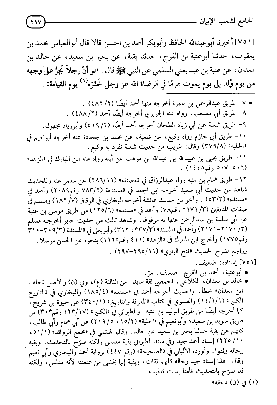 751 - أَخْبَرَنَا أَبُو عَبْدِ اللهِ الْحَافِظُ، وَأَبُو بَكْرِ أَحْمَدُ بْنُ الْحَسَنِ قَالَا: قَالَ أَبُو الْعَبَّاسِ مُحَمَّدُ بْنُ يَعْقُوبَ، حَدَّثَنَا أَبُو عُتْبَةَ بْنُ الْفَرَجِ، حَدَّثَنَا بَقِيَّةُ، عَنْ بَحِيرِ بْنِ سَعْدٍ، عَنْ خَالِدِ بْنِ مَعْدَانَ، عَنْ عُتْبَةَ بْنِ عَبْدٍ يَعْنِي السُّلَمِيَّ، عَنِ النَّبِيِّ صَلَّى اللَّهُ عَلَيْهِ وَسَلَّمَ قَالَ: §" لَوْ أَنَّ رَجُلًا يُجَرُّ عَلَى وَجْهِهِ مَنْ يَوْمِ وُلِدَ إِلَى يَوْمِ يَمُوتُ هَرَمًا فِي مَرْضَاةِ اللهِ عَزَّ وَجَلَّ لَحَقَّرَهُ يَوْمَ الْقِيَامَةِ "