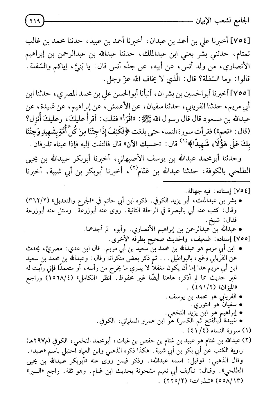 755 - أَخْبَرَنَا أَبُو الْحُسَيْنِ بْنُ بِشْرَانَ، أَنْبَأَنَا أَبُو الْحَسَنِ عَلِيُّ بْنُ مُحَمَّدٍ الْمِصْرِيُّ، حَدَّثَنَا ابْنُ أَبِي مَرْيَمَ، حَدَّثَنَا الْفِرْيَابِيُّ، حَدَّثَنَا سُفْيَانُ، عَنِ الْأَعْمَشِ، عَنْ إِبْرَاهِيمَ، عَنْ عَبِيْدَةَ، عَنْ عَبْدِ اللهِ بْنِ مَسْعُودٍ قَالَ: قَالَ رَسُولُ اللهِ صَلَّى اللَّهُ عَلَيْهِ وَسَلَّمَ: " §اقْرَأْ فَقُلْتُ: أَقْرَأُ عَلَيْكَ وَعَلَيْكَ أُنْزِلَ؟ قَالَ: نَعَمْ فَقَرَأْتُ سُورَةَ النِّسَاءِ حَتَّى بَلَغْتُ {فَكَيْفَ إِذَا جِئْنَا مِنْ كُلِّ أُمَّةٍ بِشَهِيدٍ وَجِئْنَا بِكَ عَلَى هَؤُلَاءِ شَهِيدًا} [النساء: 41] قَالَ: حَسْبُكَ الْآنَ قَالَ: فَالْتَفَتُّ إِلَيْهِ فَإِذَا عَيْنَاهُ تَذْرِفَانِ " وَحَدَّثَنَا أَبُو مُحَمَّدٍ عَبْدُ اللهِ بْنُ يُوسُفَ الْأَصْبَهَانِيُّ، أَخْبَرَنَا أَبُو بَكْرٍ عُبَيْدُ اللهِ بْنُ يَحْيَى الطَّلْحِيُّ بِالْكُوفَةِ، حَدَّثَنَا عَبْدُ اللهِ بْنُ غَنَّامٍ، أَخْبَرَنَا أَبُو بَكْرِ بْنُ أَبِي شَيْبَةَ، أَخْبَرَنَا -[220]- حَفْصُ بْنُ غِيَاثٍ، عَنِ الْأَعْمَشِ. . . فَذَكَرَهُ بِإِسْنَادِهِ نَحْوَهُ غَيْرَ أَنَّهُ قَالَ: " اقْرَأْ عَلَيَّ الْقُرْآنَ " قُلْتُ: يَا رَسُولَ اللهِ، أَقْرَأُ عَلَيْكَ وَعَلَيْكَ أُنْزِلَ قَالَ: إِنِّي أَشْتَهِي أَنْ أَسْمَعَهُ مِنْ غَيْرِي - ثُمَّ ذَكَرَهُ وَلَمْ يَقُلْ حَسْبُكَ - وَقَالَ: فَرَفَعْتُ رَأْسِي أَوْ غَمَزَنِي رَجُلٌ إِلَى جَنْبِي فَرَفَعْتُ رَأْسِي فَإِذَا دُمُوعُهُ تَسِيلُ. رَوَاهُ الْبُخَارِيُّ فِي الصَّحِيحِ، عَنِ الْفِرْيَابِيِّ وَعَنْ عُمَرَ بْنِ حَفْصٍ، عَنْ أَبِيهِ وَرَوَاهُ مُسْلِمٌ، عَنْ أَبِي بَكْرِ بْنِ أَبِي شَيْبَةَ