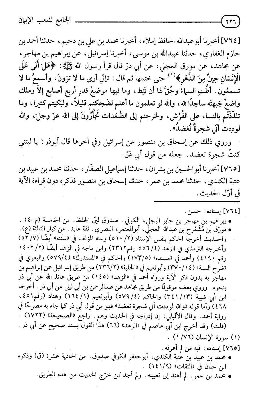 764 - أَخْبَرَنَا أَبُو عَبْدِ اللهِ الْحَافِظُ، إِمْلَاءً أخبرنا مُحَمَّدُ بْنُ عَلِيِّ بْنِ دُحَيْمٍ، حَدَّثَنَا أَحْمَدُ بْنُ حَازِمٍ الْغِفَارِيُّ، حَدَّثَنَا عُبَيْدُ اللهِ بْنُ مُوسَى، أَخْبَرَنَا إِسْرَائِيلُ، عَنْ إِبْرَاهِيمَ بْنِ مُهَاجِرٍ، عَنْ مُجَاهِدٍ، عَنْ مُوَرِّقٍ الْعِجْلِيِّ، عَنْ أَبِي ذَرٍّ قَالَ: قَرَأَ رَسُولُ اللهِ صَلَّى اللَّهُ عَلَيْهِ وَسَلَّمَ {هَلْ أَتَى عَلَى الْإِنْسَانِ حِينٌ مِنَ الدَّهْرِ} [الإنسان: 1] حَتَّى خَتَمَهَا ثُمَّ قَالَ: " §إِنِّي أَرَى مَا لَا تَرَوْنَ، وَأَسْمَعُ مَا لَا تَسْمَعُونَ أَطَّتِ السَّمَاءُ وَحَقَّ لَهَا أَنْ تَئِطَّ، وَمَا فِيهَا مَوْضِعُ قَدْرِ أَرْبَعِ أَصَابِعِ، إِلَّا وَمَلَكٌ وَاضِعٌ جَبْهَتَهُ سَاجِدًا لِلَّهِ، وَاللهِ لَوْ تَعْلَمُونَ مَا أَعْلَمُ لَضَحِكْتُمْ قَلِيلًا وَلَبَكَيْتُمْ كَثِيرًا، وَمَا تَلَذَّذْتُمْ بِالنِّسَاءِ عَلَى الْفُرُشِ وَلَخَرَجْتُمْ إِلَى الصُّعُدَاتِ تَجْأَرُونَ إِلَى اللهِ عَزَّ وَجَلَّ وَاللهِ لَوَدِدْتُ أَنِّي شَجَرَةٌ تُعْضَدُ " وَرُوِيَ ذَلِكَ عَنْ إِسْحَاقَ بْنِ مَنْصُورٍ، عَنْ إِسْرَائِيلَ وَفِي آخِرِهِ قَالَ أَبُو ذَرٍّ: يَا لَيْتَنِي كُنْتُ شَجَرَةً تُعْضَدُ، جَعَلَهُ مِنْ قَوْلِ أَبِي ذَرٍّ