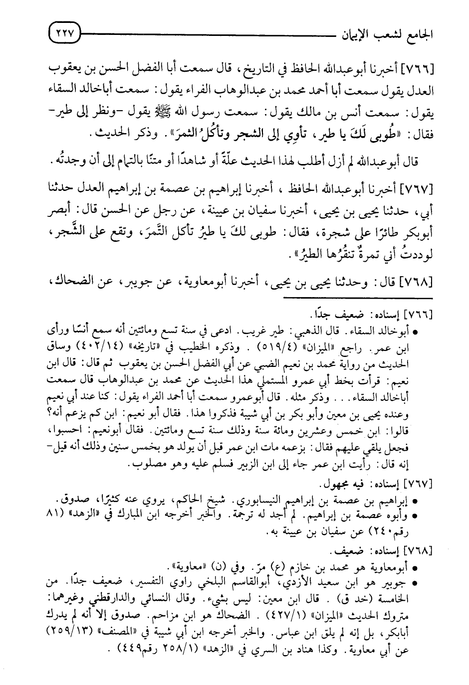766 - أَخْبَرَنَا أَبُو عَبْدِ اللهِ الْحَافِظُ فِي التَّارِيخِ قَالَ: سَمِعْتُ أَبَا الْفَضْلِ الْحَسَنَ بْنَ يَعْقُوبَ الْعَدْلَ يَقُولُ: سَمِعْتُ أَبَا أَحْمَدَ مُحَمَّدَ بْنَ عَبْدِ الْوَهَّابِ الْفَرَّاءَ يَقُولُ: سَمِعْتُ أَبَا خَالِدٍ السِّقَاءَ يَقُولُ: سَمِعْتُ أَنَسَ بْنَ مَالِكٍ يَقُولُ: سَمِعْتُ رَسُولَ اللهِ صَلَّى اللَّهُ عَلَيْهِ وَسَلَّمَ يَقُولُ: " - §وَنَظَرَ إِلَى طَيْرٍ - فَقَالَ: طُوبَى لَكَ يَا طَيْرُ تَأْوِي إِلَى الشَّجَرِ وَتَأْكُلُ الثَّمَرَ "، وَذَكَرَ الْحَدِيثَ قَالَ أَبُو عَبْدِ اللهِ: لَمْ أَزَلْ أَطْلُبُ لِهَذَا الْحَدِيثِ عِلَّةً، أَوْ شَاهِدًا، أَوْ مَتْنًا بِالتَّمَامِ إِلَى أَنْ وَجَدْتُهُ