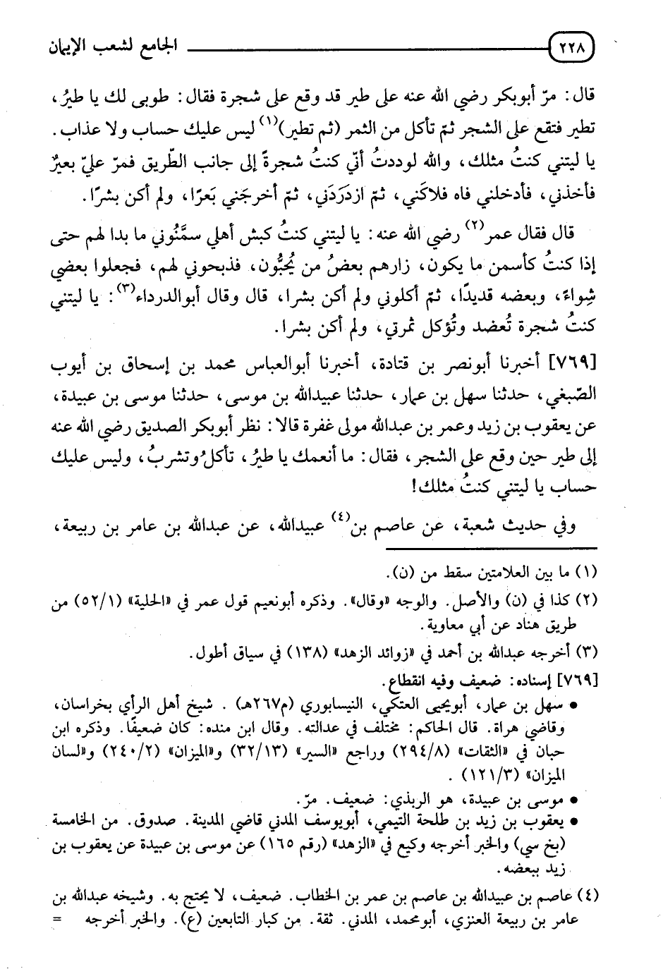 769 - أَخْبَرَنَا أَبُو نَصْرِ بْنُ قَتَادَةَ، أَخْبَرَنَا أَبُو الْعَبَّاسِ مُحَمَّدُ بْنُ إِسْحَاقَ بْنِ أَيُّوبَ الصِّبْغِيُّ، حَدَّثَنَا سَهْلُ بْنُ عَمَّارٍ، حَدَّثَنَا عُبَيْدُ اللهِ بْنُ مُوسَى، حَدَّثَنَا مُوسَى بْنُ عُبَيْدَةَ، عَنْ يَعْقُوبَ بْنِ زَيْدٍ، وَعُمَرَ بْنِ عَبْدِ اللهِ مَوْلَى غُفْرَةَ قَالَا: نَظَرَ أَبُو بَكْرٍ الصِّدِّيقُ رَضِيَ اللهُ عَنْهُ إِلَى طَيْرٍ حِينَ وَقَعَ عَلَى الشَّجَرِ فَقَالَ: " §مَا أَنْعَمَكَ يَا طَيْرُ تَأْكُلُ وَتَشْرَبُ وَلَيْسَ عَلَيْكَ حِسَابٌ، يَا لَيْتَنِي كُنْتُ مِثْلَكَ "