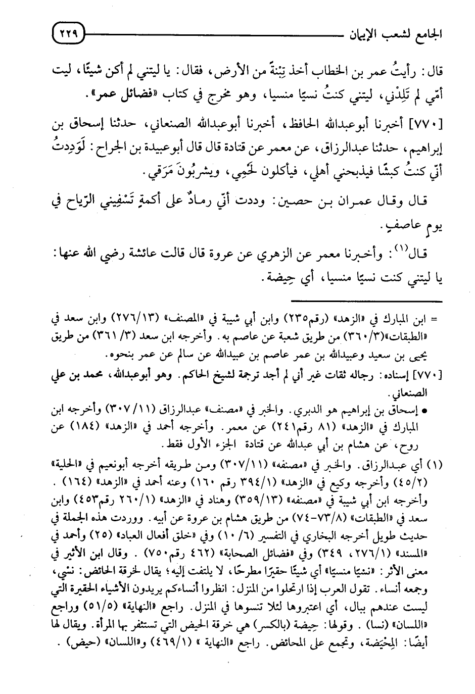 قَالَ: وَأَخْبَرَنَا مَعْمَرٌ، عَنِ الزُّهْرِيِّ، عَنْ عُرْوَةَ قَالَ: قَالَتْ عَائِشَةُ رَضِيَ اللهُ عَنْهَا: " §يَا لَيْتَنِي كُنْتُ نَسِيًّا مَنْسِيًّا أَيْ: حَيْضَةً "