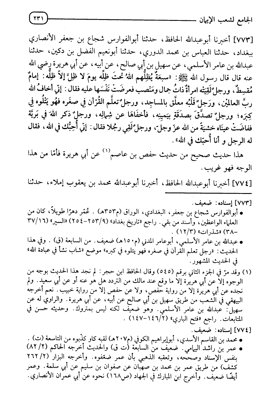 773 - أَخْبَرَنَا أَبُو عَبْدِ اللهِ الْحَافِظُ، حَدَّثَنَا أَبُو الْفَوَارِسِ شُجَاعُ بْنُ جَعْفَرٍ الْأَنْصَارِيُّ، بِبَغْدَادَ، حَدَّثَنَا الْعَبَّاسُ بْنُ مُحَمَّدٍ الدُّورِيُّ، حَدَّثَنَا أَبُو نُعَيْمٍ الْفَضْلُ بْنُ دُكَيْنٍ، حَدَّثَنَا عَبْدُ اللهِ بْنُ عَامِرٍ الْأَسْلَمِيُّ، عَنْ سُهَيْلِ بْنِ أَبِي صَالِحٍ، عَنْ أَبِيهِ، عَنْ أَبِي هُرَيْرَةَ رَضِيَ اللهُ عَنْهُ قَالَ: قَالَ رَسُولُ اللهِ صَلَّى اللَّهُ عَلَيْهِ وَسَلَّمَ: §" سَبْعَةٌ يُظِلُّهُمُ اللهُ تَحْتَ ظِلِّهِ يَوْمَ لَا ظِلَّ إِلَّا ظِلُّهُ، إِمَامٌ مُقْسِطٌ وَرَجُلٌ لَقِيَتْهُ امْرَأَةٌ ذَاتُ جَمَالٍ وَمَنْصِبٍ فَعَرَضَتْ نَفْسَهَا عَلَيْهِ فَقَالَ: إِنِّي أَخَافُ اللهَ رَبَّ الْعَالَمِينَ، وَرَجُلٌ قَلْبُهُ مُعَلَّقٌ بِالْمَسَاجِدِ وَرَجُلٌ تَعَلَّمَ الْقُرْآنَ فِي صِغَرِهِ فَهُوَ يَتْلُوهُ فِي كِبَرِهِ وَرَجُلٌ تَصَدَّقَ بِصَدَقَةٍ بِيَمِينِهِ فَأَخْفَاهَا عَنْ شِمَالِهِ، وَرَجُلٌ ذَكَرَ اللهَ فِي بَرِّيَّةٍ فَفَاضَتْ عَيْنَاهُ خَشْيَةً مِنَ اللهِ عَزَّ وَجَلَّ، وَرَجُلٌ لَقِيَ رَجُلًا فَقَالَ: إِنِّي أُحِبُّكَ فِي اللهِ فَقَالَ: لَهُ الرَّجُلُ وَأَنَا أُحِبُّكَ فِي اللهِ " هَذَا حَدِيثُ صَحِيحُ مِنْ حَدِيثِ حَفْصِ بْنِ عَاصِمٍ، عَنْ أَبِي هُرَيْرَةَ فَأَمَّا مِنْ هَذَا الْوَجْهِ فَهُوَ غَرِيبٌ