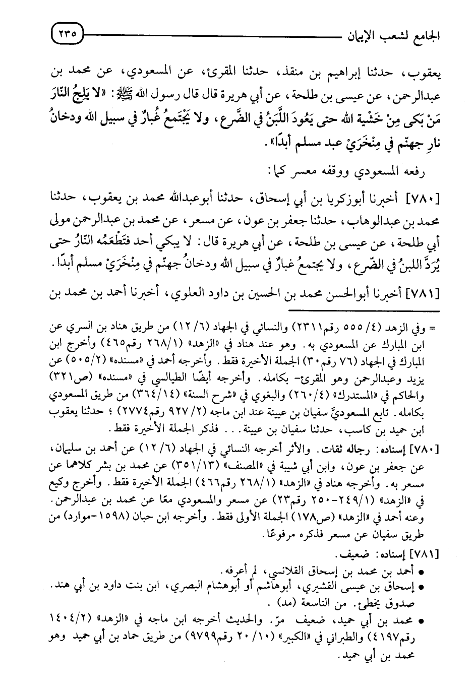 780 - أَخْبَرَنَاهُ أَبُو زَكَرِيَّا بْنُ أَبِي إِسْحَاقَ، حَدَّثَنَا أَبُو عَبْدِ اللهِ مُحَمَّدُ بْنُ يَعْقُوبَ، حَدَّثَنَا مُحَمَّدُ بْنُ عَبْدِ الْوَهَّابِ، حَدَّثَنَا جَعْفَرُ بْنُ عَوْنٍ، عَنْ مِسْعَرٍ، عَنْ مُحَمَّدِ بْنِ عَبْدِ الرَّحْمَنِ، مَوْلَى أَبِي طَلْحَةَ، عَنْ عِيسَى بْنِ طَلْحَةَ، عَنْ أَبِي هُرَيْرَةَ قَالَ: " §لَا يَبْكِي أَحَدٌ فَتَطْعَمَهُ النَّارُ، حَتَّى يُرَدَّ اللَّبَنُ فِي الضَّرْعِ، وَلَا يَجْتَمِعُ غُبَارٌ فِي سَبِيلِ اللهِ، وَدُخَانُ جَهَنَّمَ فِي مَنْخَرَيْ مُسْلِمٍ أَبَدًا "