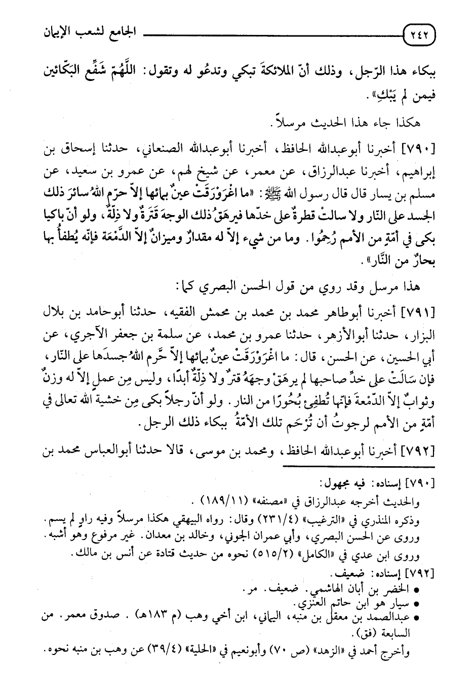 790 - أَخْبَرَنَا أَبُو عَبْدِ اللهِ الْحَافِظُ، أَخْبَرَنَا أَبُو عَبْدِ اللهِ الصَّنْعَانِيُّ، حَدَّثَنَا إِسْحَاقُ بْنُ إِبْرَاهِيمَ، أَخْبَرَنَا عَبْدُ الرَّزَّاقِ، عَنْ مَعْمَرٍ، عَنْ شَيْخٍ، لَهُمْ، عَنْ عَمْرِو بْنِ سَعِيدٍ، عَنْ مُسْلِمِ بْنِ يَسَارٍ قَالَ: قَالَ رَسُولُ اللهِ صَلَّى اللَّهُ عَلَيْهِ وَسَلَّمَ: §" مَا اغْرَوْرَقَتْ عَيْنٌ بِمَائِهَا إِلَّا حَرَّمَ اللهُ سَائِرَ ذَلِكَ الْجَسَدِ عَلَى النَّارِ، وَلَا سَالَتْ قَطْرَةٌ عَلَى خَدِّهَا فَيَرْهَقُ ذَلِكَ الْوَجْهَ قَتْرَةٌ، وَلَا ذِلَّةٌ وَلَوْ أَنَّ بَاكِيًا بَكَى فِي أُمَّةٍ مِنَ الْأُمَمِ رُحِمُوا وَمَا مِنْ شَيْءٍ، إِلَّا لَهُ مِقْدَارٌ وَمِيزَانٌ إِلَّا الدَّمْعَةَ فَإِنَّهُ يُطْفَأُ بِهَا بِحَارٌ مِنَ النَّارِ " هَذَا مُرْسَلٌ وَقَدْ رُوِيَ مِنْ قَوْلِ الْحَسَنِ الْبَصْرِيِّ كَمَا