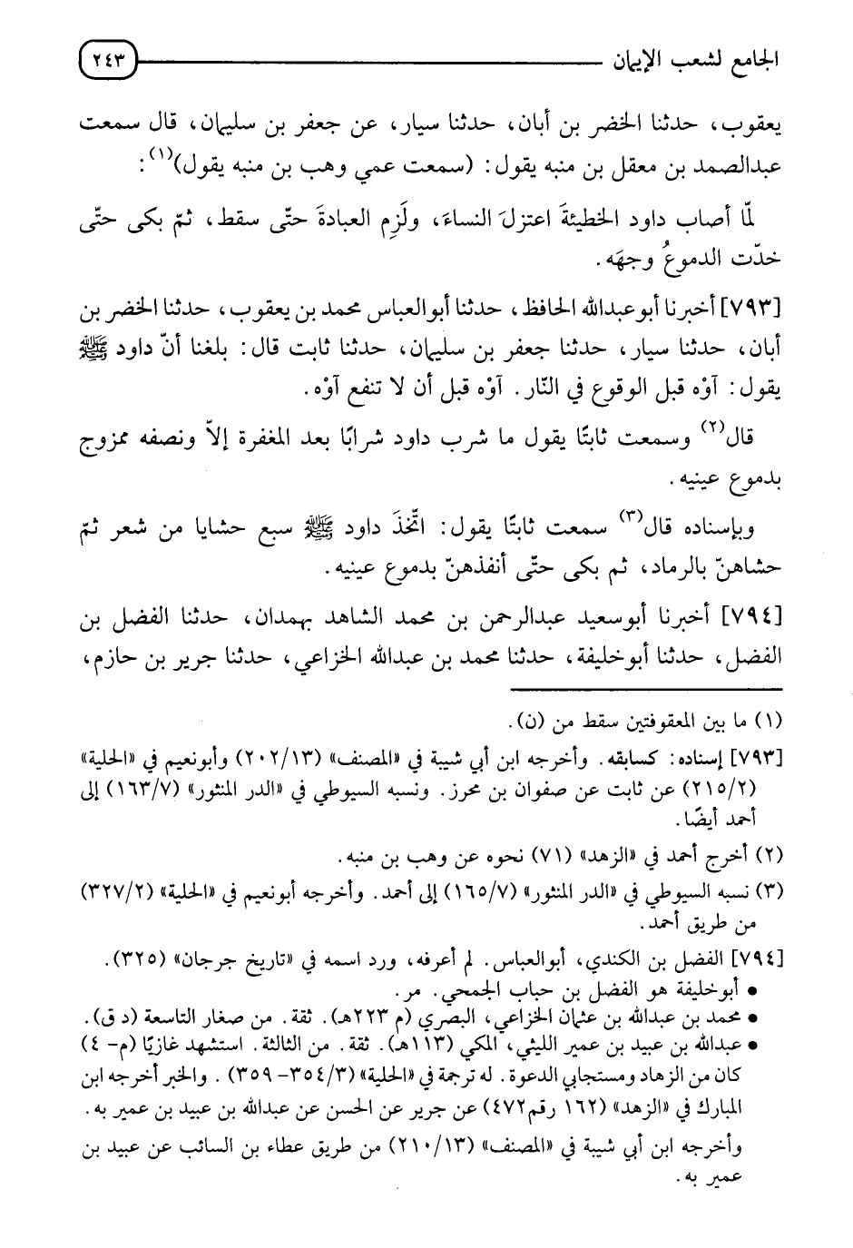 793 - أَخْبَرَنَا أَبُو عَبْدِ اللهِ الْحَافِظُ، حَدَّثَنَا أَبُو الْعَبَّاسِ مُحَمَّدُ بْنُ يَعْقُوبَ، حَدَّثَنَا الْخَضِرُ بْنُ أَبَانَ، حَدَّثَنَا سَيَّارٌ، حَدَّثَنَا جَعْفَرُ بْنُ سُلَيْمَانَ، حَدَّثَنَا ثَابِتٌ قَالَ: " §بَلَغَنَا أَنَّ دَاوُدَ، عَلَيْهِ السَّلَامُ يَقُولُ: أَوَّهْ قَبْلَ الْوقُوعِ فِي النَّارِ أَوَّهْ قَبْلَ أَنْ لَا تَنْفَعَ أَوَّهْ قَالَ: وَسَمِعْتُ ثَابِتًا يَقُولُ: مَا شَرِبَ دَاوُدُ شَرَابًا بَعْدَ الْمَغْفِرَةِ إِلَّا وَنِصْفُهُ مَمْزُوجٌ بِدُمُوعِ عَيْنَيْهِ "