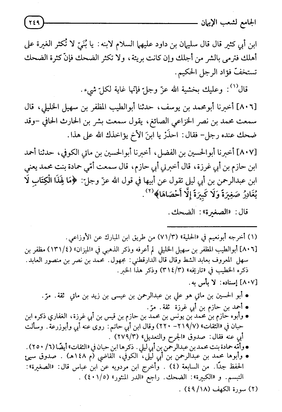 807 - أَخْبَرَنَا أَبُو الْحُسَيْنِ بْنُ الْفَضْلِ، أَخْبَرَنَا أَبُو الْحُسَيْنِ بْنُ مَاتِي الْكُوفِيُّ، حَدَّثَنَا أَحْمَدُ بْنُ حَازِمِ بْنِ أَبِي غَرَزَةَ قَالَ: أَخْبَرَنِي أَبِي حَازِمٍ قَالَ: سَمِعْتُ أُمِّي حَمَّادَةَ بِنْتَ مُحَمَّدٍ يَعْنِي ابْنَ عَبْدِ الرَّحْمَنِ بْنِ أَبِي لَيْلَى تَقُولُ: عَنْ أَبِيهَا فِي قَوْلِ اللهِ عَزَّ وَجَلَّ " {§مَالِ هَذَا الْكِتَابِ لَا يُغَادِرُ صَغِيرَةً وَلَا كَبِيرَةً إِلَّا أَحْصَاهَا} [الكهف: 49] قَالَ: الصَّغِيرَةُ الضَّحِكُ "