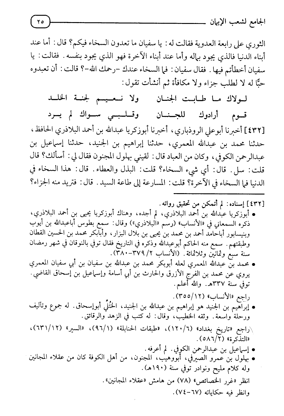 432 - أَخْبَرَنَا أَبُو عَلِيٍّ الرُّوذْبَارِيُّ، أَخْبَرَنَا أَبُو زَكَرِيَّا عَبْدُ اللهِ بْنُ أَحْمَدَ الْبَلَاذُرِيُّ الْحَافِظُ، حدثنا مُحَمَّدُ بْنُ عَبْدِ اللهِ الْعُمَرِيُّ، حدثنا إِبْرَاهِيمُ بْنُ الْجُنَيْدِ، حدثنا إِسْمَاعِيلُ بْنُ عَبْدِ الرَّحْمَنِ الْكُوفِيُّ، وَكَانَ مِنَ الْعُبَّادِ قَالَ: لَقِيَنِي بُهْلُولٌ الْمَجْنُونُ فَقَالَ لِي: " أَسْأَلُكَ ". قَالَ: قُلْتُ: سَلْ، قَالَ: " أَيُّ شَيْءٍ السَّخَاءُ؟ " قُلْتُ: الْبَذْلُ وَالْعَطَاءُ، قَالَ: " هَذَا السَّخَاءُ فِي الدُّنْيَا، فَمَا السَّخَاءُ فِي الْآخِرَةِ؟ " قُلْتُ: الْمُسَارَعَةُ إِلَى طَاعَةِ السَّيِّدِ، قَالَ: " فَتُرِيدُ مِنْهُ الْجَزَاءَ؟ " -[26]- قُلْتُ: نَعَمْ بِالْوَاحِدَةِ عَشَرَةٌ، قَالَ: " §هَذَا فِي الدِّينِ قَبِيحٌ، وَلَكِنَّ الْمُسَارَعَةَ لِطَاعَةِ سَيِّدِي أَنْ لَا يَطَّلِعَ عَلَى قَلْبِكَ، وَأَنْتَ تُرِيدُ مِنْهُ شَيْئًا بِشَيْءٍ "
