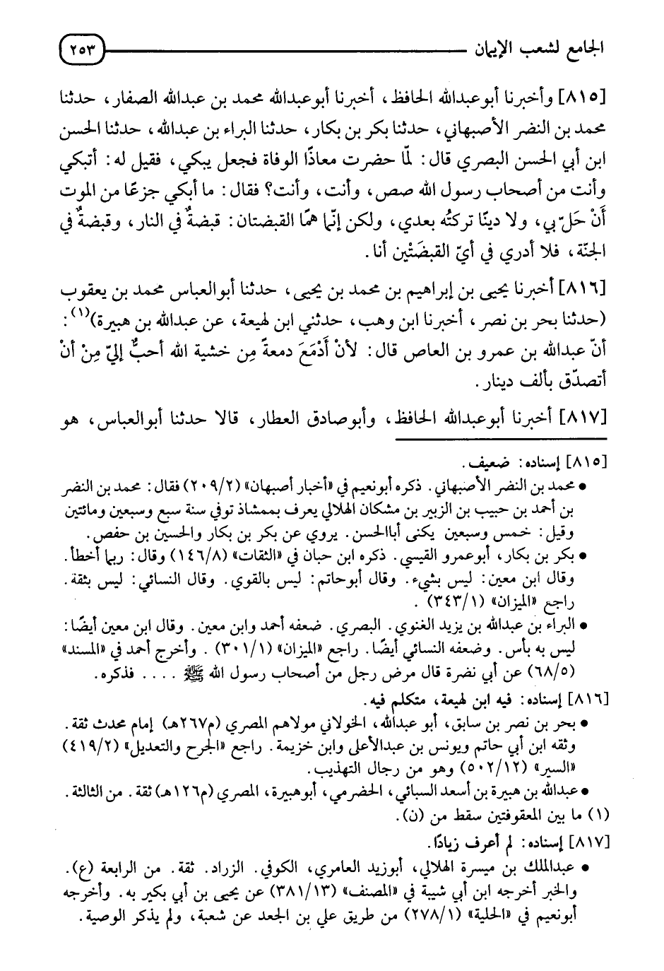 816 - أَخْبَرَنَا يَحْيَى بْنُ إِبْرَاهِيمَ بْنِ مُحَمَّدِ بْنِ يَحْيَى، حَدَّثَنَا أَبُو الْعَبَّاسِ مُحَمَّدُ بْنُ يَعْقُوبَ، حَدَّثَنَا بَحْرُ بْنُ نَصْرٍ، أَخْبَرَنَا ابْنُ وَهْبٍ، حَدَّثَنِي ابْنُ لَهِيعَةَ، عَنْ عَبْدِ اللهِ بْنِ هُبَيْرَةَ، أَنَّ عَبْدَ اللهِ بْنَ عَمْرِو بْنِ الْعَاصِ قَالَ: §" لَأَنْ أَدْمَعَ دَمْعَةً مِنْ خَشْيَةِ اللهِ أَحَبُّ إِلَيَّ مِنْ أَنْ أَتَصَدَّقَ بِأَلْفِ دِينَارٍ "