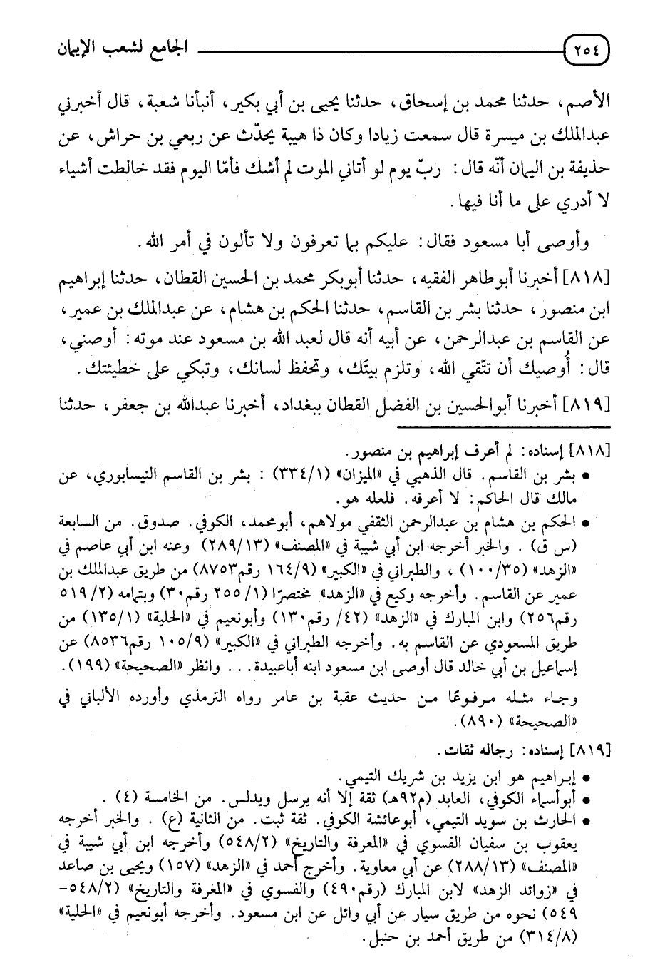818 - أَخْبَرَنَا أَبُو طَاهِرٍ الْفَقِيهُ، حَدَّثَنَا أَبُو بَكْرٍ مُحَمَّدُ بْنُ الْحُسَيْنِ الْقَطَّانُ، حَدَّثَنَا إِبْرَاهِيمُ بْنُ مَنْصُورٍ، حَدَّثَنَا بِشْرُ بْنُ الْقَاسِمِ، حَدَّثَنَا الْحَكَمُ بْنُ هِشَامٍ، عَنْ عَبْدِ الْمَلِكِ بْنِ عُمَيْرٍ، عَنِ الْقَاسِمِ بْنِ عَبْدِ الرَّحْمَنِ، عَنْ أَبِيهِ، أَنَّهُ قَالَ: لِعَبْدِ اللهِ بْنِ مَسْعُودٍ عِنْدَ مَوْتِهِ: أَوْصِنِي قَالَ: " §أُوصِيكَ أَنْ تَتَّقِيَ اللهَ وَتَلْزَمَ بَيْتَكَ، وَتَحْفَظَ لِسَانَكَ، وَتَبْكِيَ عَلَى خَطِيئَتِكَ "