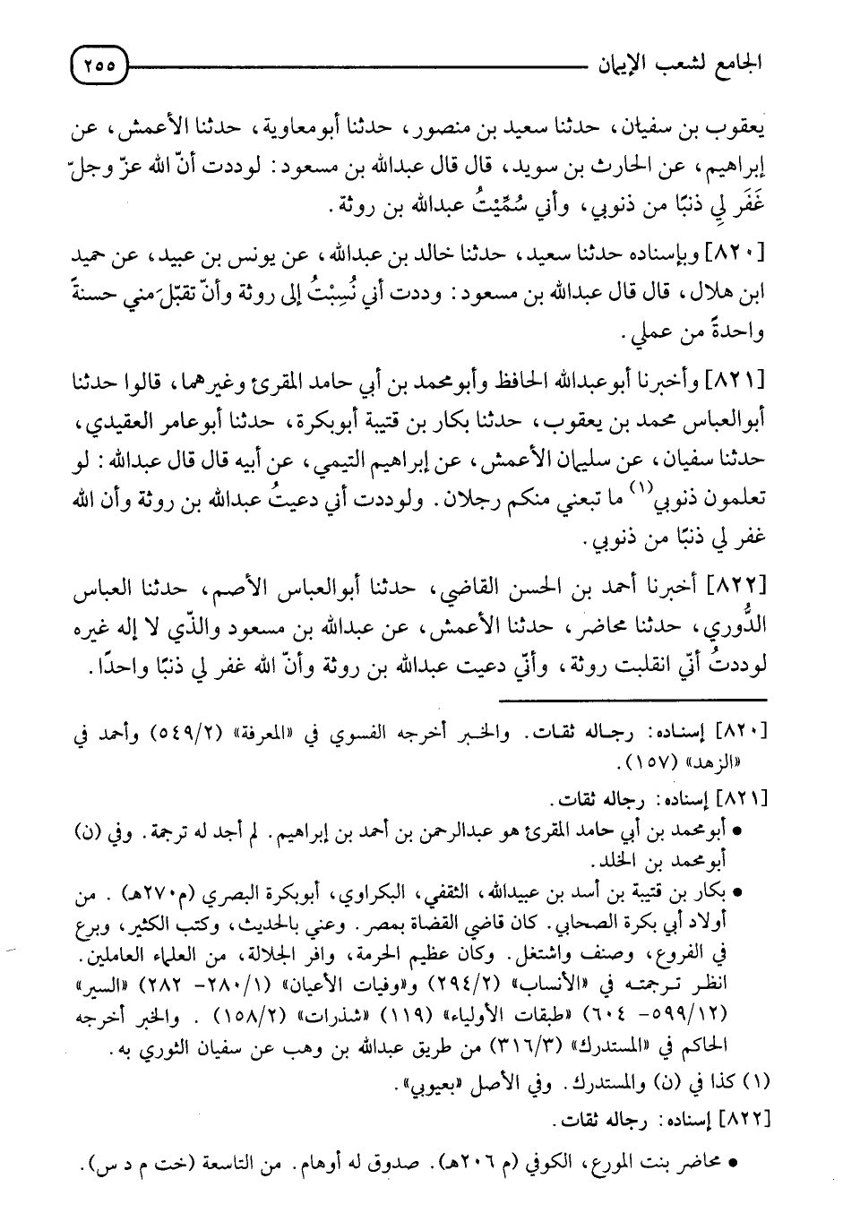 822 - أَخْبَرَنَا أَحْمَدُ بْنُ الْحَسَنِ الْقَاضِي، حَدَّثَنَا أَبُو الْعَبَّاسِ الْأَصَمُّ، حَدَّثَنَا الْعَبَّاسُ الدُّورِيُّ، حَدَّثَنَا مُحَاضِرٌ، حَدَّثَنَا الْأَعْمَشُ، عَنْ إِبْرَاهِيمَ التَّيْمِيِّ، عَنْ أَبِيهِ قَالَ عَبْدُ اللهِ: " §وَالَّذِي لَا إِلَهَ غَيْرُهُ لَوَدِدْتُ أَنِّي انْقَلَبْتُ رَوْثَةً، وَأَنِّي دُعِيتُ عَبْدَ اللهِ بْنَ رَوْثَةٍ، وَأَنَّ اللهَ غَفَرَ لِي ذَنْبًا وَاحِدًا "
