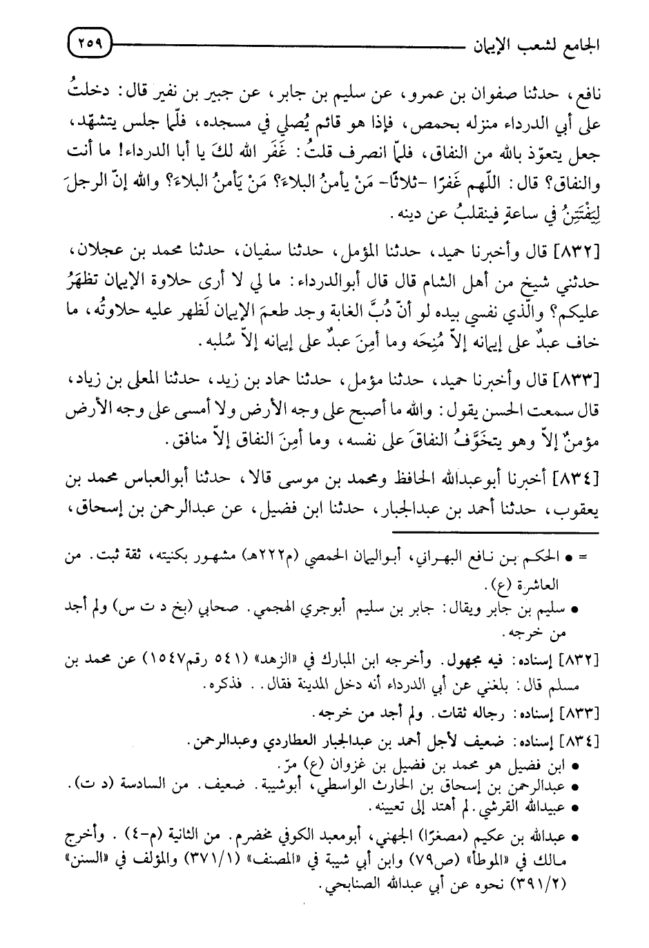 832 - قَالَ: وَأَخْبَرَنَا حُمَيْدٌ، حَدَّثَنَا الْمُؤَمَّلُ، حَدَّثَنَا سُفْيَانُ، حَدَّثَنَا مُحَمَّدُ بْنُ عَجْلَانَ، حَدَّثَنِي شَيْخٌ، مِنْ أَهْلِ الشَّامِ قَالَ: قَالَ أَبُو الدَّرْدَاءِ: " §مَا لِي لَا أَرَى حَلَاوَةَ الْإِيمَانِ تَظْهَرُ عَلَيْكُمْ، وَالَّذِي نَفْسِي بِيَدِهِ، لَوْ أَنَّ دُبَّ الْغَابَةِ، وَجَدَ طَعْمَ الْإِيمَانِ لَظَهَرَ عَلَيْهِ حَلَاوَتُهُ مَا خَافَ عَبْدٌ عَلَى إِيمَانِهِ إِلَّا مُنِحَهُ، وَمَا أَمِنَ عَبْدٌ عَلَى إِيمَانِهِ إِلَّا سُلِبَهُ "