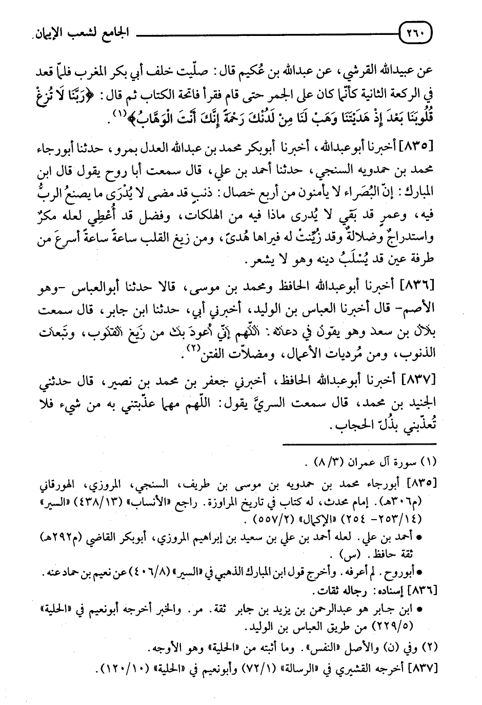 836 - أَخْبَرَنَا أَبُو عَبْدِ اللهِ الْحَافِظُ، وَمُحَمَّدُ بْنُ مُوسَى قَالَا: حَدَّثَنَا أَبُو الْعَبَّاسِ، وَهُوَ الْأَصَمُّ قَالَ: أَخْبَرَنَا الْعَبَّاسُ بْنُ الْوَلِيدِ، أَخْبَرَنِي أَبِي، حَدَّثَنَا ابْنُ جَابِرٍ قَالَ: سَمِعْتُ بِلَالَ بْنَ سَعْدٍ وَهُوَ يَقُولُ فِي دُعَائِهِ: " §اللهُمَّ إِنِّي أَعُوذُ بِكَ مِنْ زَيْغِ الْقُلُوبِ، وَتَبَعَاتِ الذُّنُوبِ، وَمِنْ مُرْدِيَاتِ الْأَعْمَالِ وَمُضِلَّاتِ الفتن "