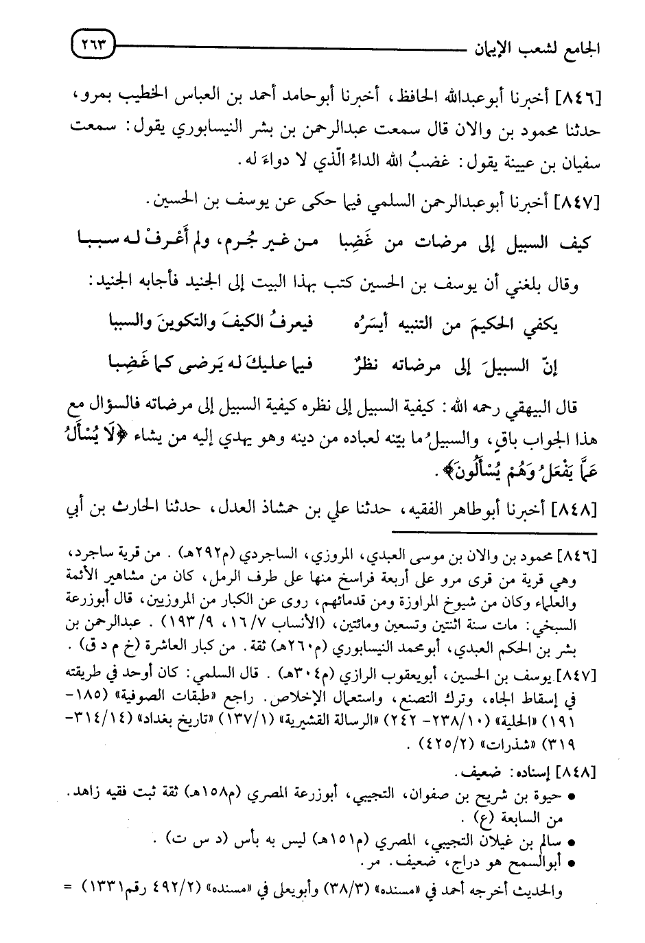 846 - أَخْبَرَنَا أَبُو عَبْدِ اللهِ الْحَافِظُ، أَخْبَرَنَا أَبُو حَامِدٍ أَحْمَدُ بْنُ الْعَبَّاسِ الْخَطِيبُ بِمَرْوَ، حَدَّثَنَا مَحْمُودُ بْنُ وَالَانَ قَالَ: سَمِعْتُ عَبْدَ الرَّحْمَنِ بْنَ بِشْرٍ النَّيْسَابُورِيَّ يَقُولُ: سَمِعْتُ سُفْيَانَ بْنَ عُيَيْنَةَ يَقُولُ: §" غَضَبُ اللهِ الدَّاءُ الَّذِي لَا دَوَاءَ لَهُ "