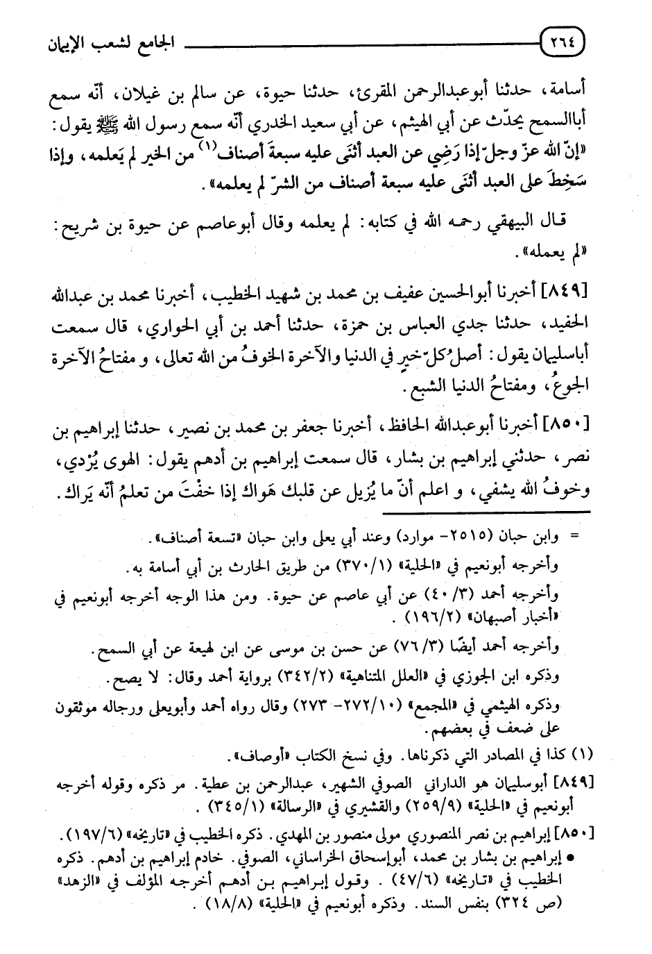 850 - أَخْبَرَنَا أَبُو عَبْدِ اللهِ الْحَافِظُ، أَخْبَرَنَا جَعْفَرُ بْنُ مُحَمَّدِ بْنِ نُصَيْرٍ، حَدَّثَنَا إِبْرَاهِيمُ بْنُ نَصْرٍ، حَدَّثَنِي إِبْرَاهِيمُ بْنُ بَشَّارٍ قَالَ: سَمِعْتُ إِبْرَاهِيمَ بْنَ أَدْهَمَ يَقُولُ: " §الْهَوَى يُرْدِي وَخَوْفُ اللهِ يَشْفِي، وَاعْلَمْ أَنَّ مَا يُزِيلُ عَنْ قَلْبِكَ هَوَاكَ، إِذَا خِفْتَ مَنْ تَعْلَمُ أَنَّهُ يَرَاكَ "