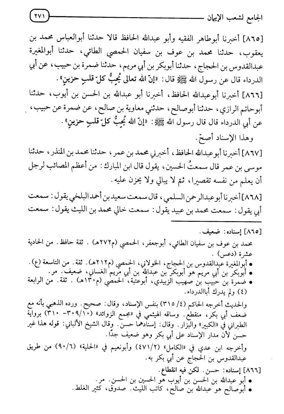 865 - أَخْبَرَنَا أَبُو طَاهِرٍ الْفَقِيهُ، وَأَبُو عَبْدِ اللهِ الْحَافِظُ قَالَا: حَدَّثَنَا أَبُو الْعَبَّاسِ مُحَمَّدُ بْنُ يَعْقُوبَ، حَدَّثَنَا مُحَمَّدُ بْنُ عَوْفِ بْنِ سُفْيَانَ الْحِمْصِيُّ الطَّائِيُّ، حَدَّثَنَا أَبُو الْمُغِيرَةِ عَبْدُ الْقُدُّوسِ بْنُ الْحَجَّاجِ، حَدَّثَنَا أَبُو بَكْرِ بْنُ أَبِي مَرْيَمَ، حَدَّثَنَا ضَمْرَةُ بْنُ حَبِيبٍ، عَنْ أَبِي الدَّرْدَاءِ قَالَ: عَنْ رَسُولِ اللهِ صَلَّى اللَّهُ عَلَيْهِ وَسَلَّمَ قَالَ: إِنَّ §" اللهَ تَعَالَى يُحِبُّ كُلَّ قَلْبٍ حَزِينٍ "