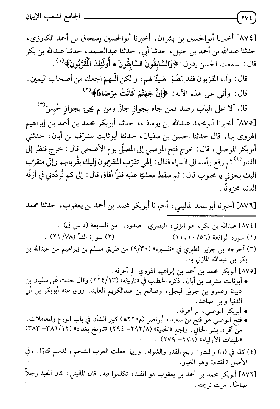 874 - أَخْبَرَنَا أَبُو الْحُسَيْنِ بْنُ بِشْرَانَ، أَخْبَرَنَا أَبُو الْحُسَيْنِ إِسْحَاقُ بْنُ أَحْمَدِ الْكَارزيُّ، حَدَّثَنَا عَبْدُ اللهِ بْنُ أَحْمَدَ بْنِ حَنْبَلٍ، حَدَّثَنَا أَبِي، حَدَّثَنَا عَبْدُ الصَّمَدِ، حَدَّثَنَا عَبْدُ اللهِ بْنُ بَكْرٍ قَالَ: سَمِعْتُ الْحَسَنَ يَقُولُ: " {§السَّابِقُونَ السَّابِقُونَ أُولَئِكَ الْمُقَرَّبُونَ} [الواقعة: 11] قَالَ: وَأَمَّا الْمُقَرَّبُونَ فَقَدْ مَضَوْا هَنِيئًا لَهُمْ، وَلَكِنِ اللهُمَّ اجْعَلْنَا مِنْ أَصْحَابِ الْيَمِينِ قَالَ: وَأَتَى عَلَى هَذِهِ الْآيَةِ {إِنَّ جَهَنَّمَ كَانَتْ مِرْصَادًا} [النبأ: 21] قَالَ: أَلَا عَلَى الْبَابِ رَصْدٌ فَمَنْ جَاءَ بِجَوَازٍ جَازَ، وَمَنْ لَمْ يَجئْ بِجَوَازْ حُبِسَ "