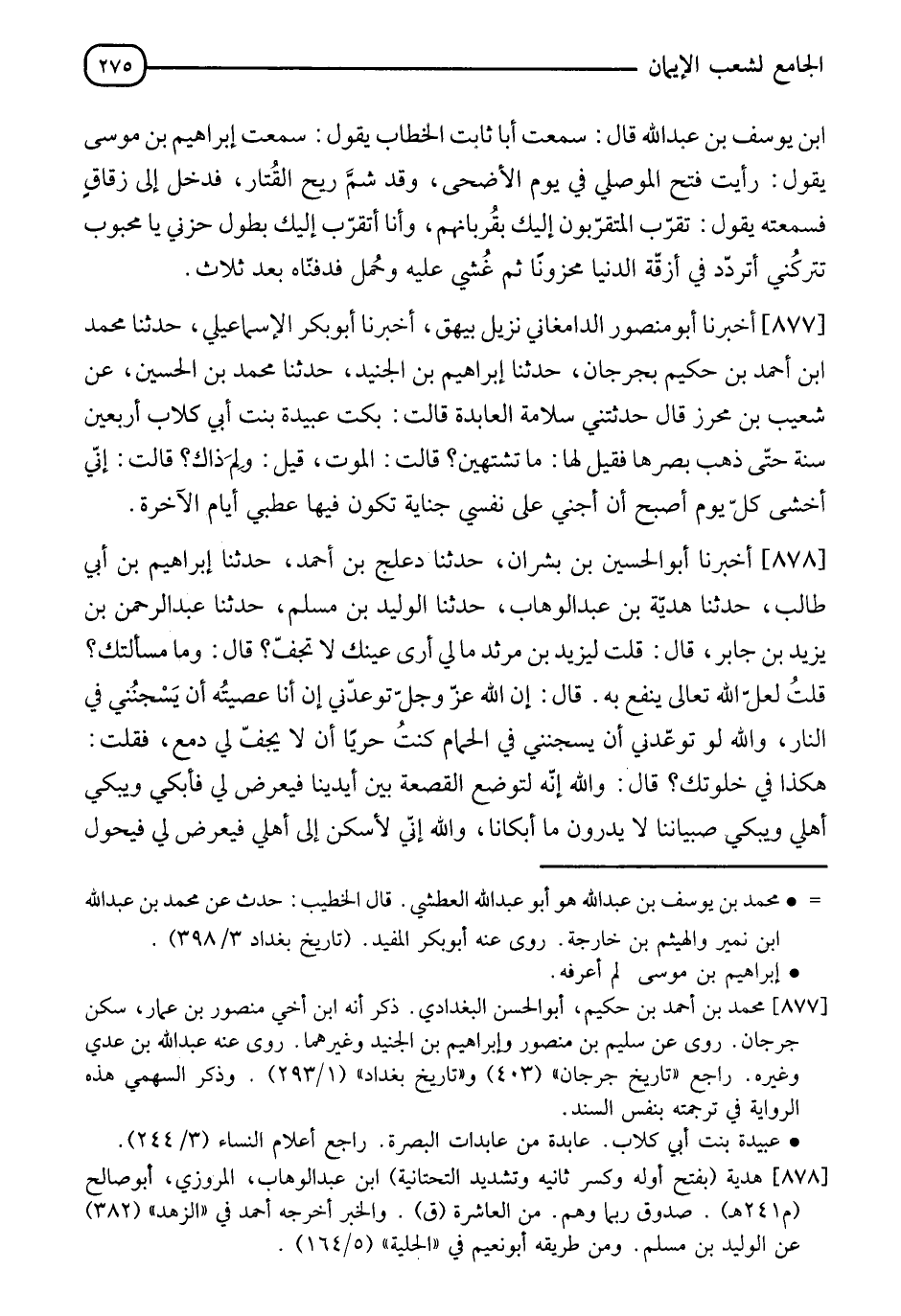 877 - أَخْبَرَنَا أَبُو مَنْصُورٍ الدَّامِغَانِيُّ نَزِيلُ بَيْهَقَ أَخْبَرَنَا أَبُو بَكْرٍ الْإِسْمَاعِيلِيُّ، حَدَّثَنَا مُحَمَّدُ بْنُ أَحْمَدَ بْنِ حَكِيمٍ بِجُرْجَانَ، حَدَّثَنَا إِبْرَاهِيمُ بْنُ الْجُنَيْدِ، حَدَّثَنَا مُحَمَّدُ بْنُ الْحُسَيْنِ، عَنْ شُعَيْبِ بْنِ مُحْرِزٍ قَالَ: حَدَّثَتْنِي سَلَّامَةُ الْعَابِدَةُ قَالَتْ: بَكَتْ عُبَيْدَةُ بِنْتُ أَبِي كِلَابٍ أَرْبَعِينَ سَنَةً حَتَّى ذَهَبَ بَصَرُهَا فَقِيلَ لَهَا: مَا تَشْتَهِينَ؟ قَالَتِ: الْمَوْتَ قِيلَ: وَلِمَ ذَاكَ؟ قَالَتْ: §" إِنِّي أَخْشَى كُلَّ يَوْمٍ أُصْبِحُ أَنْ أَجْنِيَ عَلَى نَفْسِي جِنَايَةً، تَكُونَ فِيهَا عَطْبَى أَيَّامَ الْآخِرَةِ "