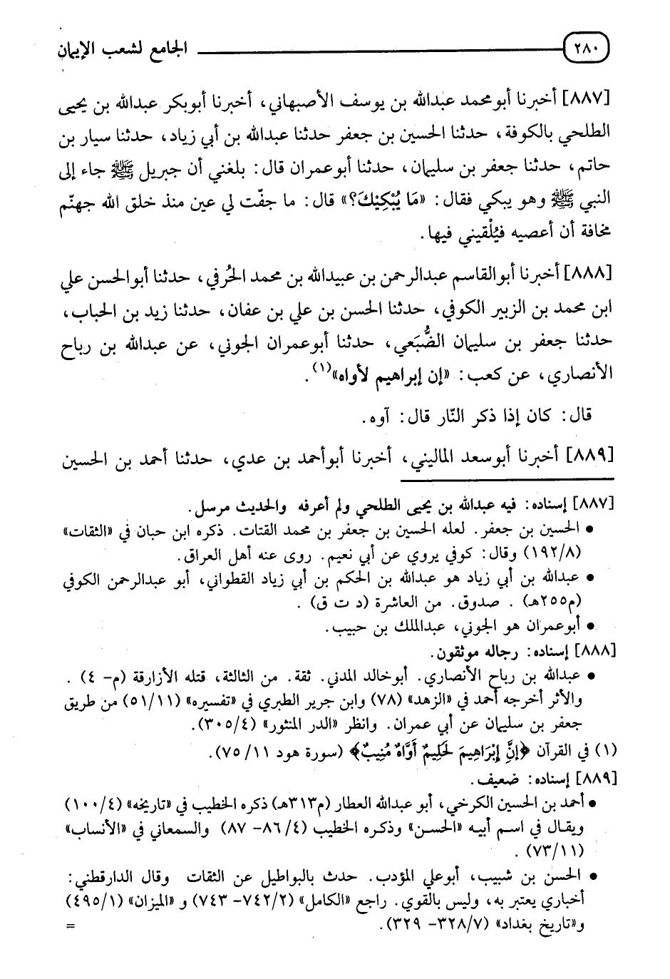 888 - أَخْبَرَنَا أَبُو الْقَاسِمِ عَبْدُ الرَّحْمَنِ بْنُ عُبَيْدِ اللهِ بْنِ مُحَمَّدٍ الْحُرْفِيُّ، حَدَّثَنَا أَبُو الْحَسَنِ عَلِيُّ بْنُ مُحَمَّدِ بْنِ الزُّبَيْرِ الْكُوفِيُّ، حَدَّثَنَا الْحَسَنُ بْنُ عَلِيِّ بْنِ عَفَّانَ، حَدَّثَنَا زَيْدُ بْنُ الْحُبَابِ، حَدَّثَنَا جَعْفَرُ بْنُ سُلَيْمَانَ الضُّبَعِيُّ، حَدَّثَنَا أَبُو عِمْرَانَ الْجَوْنِيُّ، عَنْ عَبْدِ اللهِ بْنِ رَبَاحٍ الْأَنْصَارِيِّ، عَنْ كَعْبٍ، {إِنَّ إِبْرَاهِيمَ لَأَوَّاهٌ} [التوبة: 114] قَالَ: " §كَانَ إِذَا ذَكَرَ النَّارَ قَالَ: أَوَّهْ "