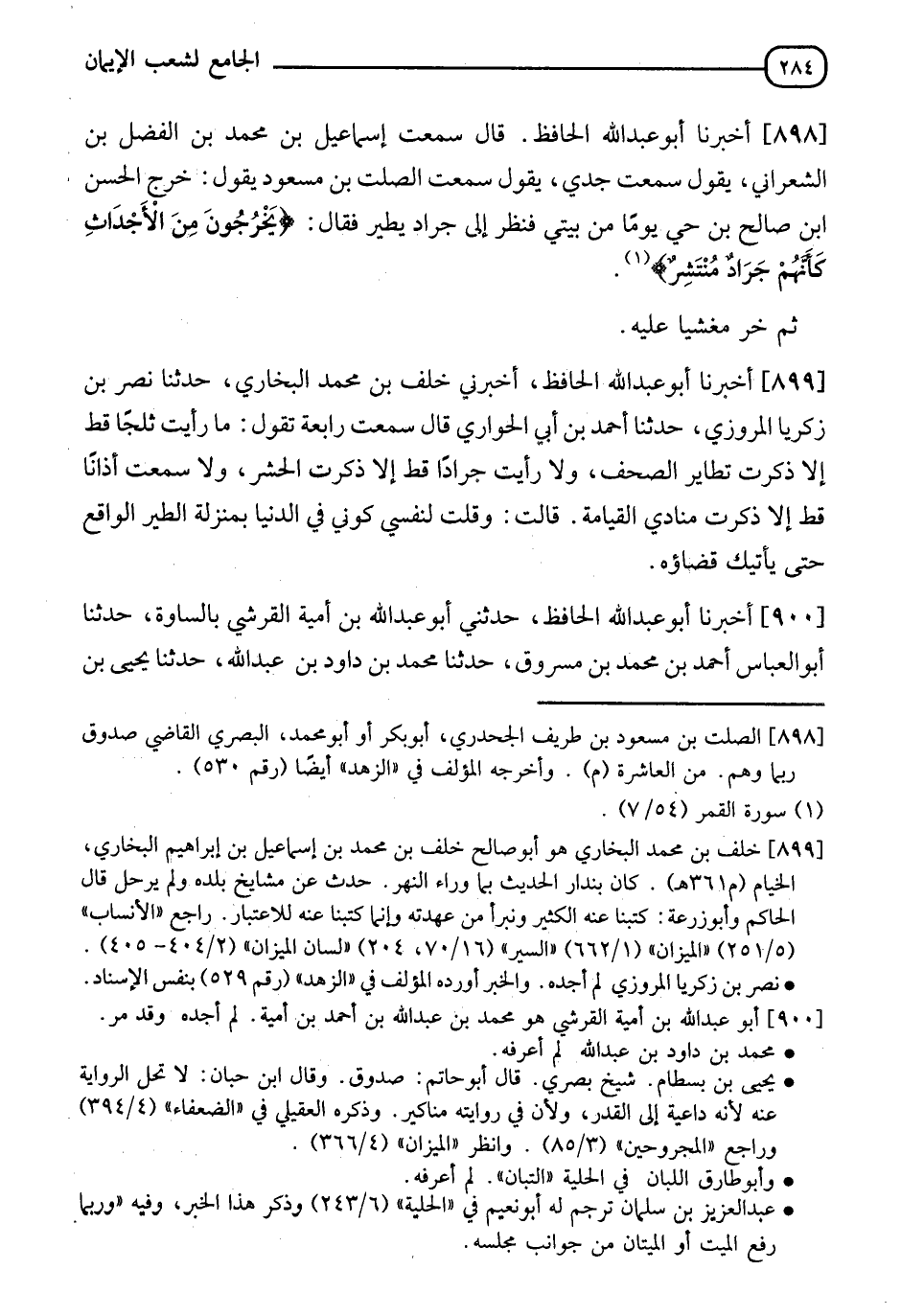 898 - أَخْبَرَنَا أَبُو عَبْدِ اللهِ الْحَافِظُ قَالَ: سَمِعْتُ إِسْمَاعِيلَ بْنَ مُحَمَّدِ بْنِ الْفَضْلِ بْنِ الشَّعْرَانِيِّ يَقُولُ: سَمِعْتُ جَدِّي يَقُولُ: سَمِعْتُ الصَّلْتَ بْنَ مَسْعُودٍ يَقُولُ: خَرَجَ الْحَسَنُ بْنُ صَالِحِ بْنِ حَيٍّ يَوْمًا مِنْ بَيْتِي فَنَظَرَ إِلَى جَرَادٍ يَطِيرُ فَقَالَ: " {§يَخْرُجُونَ مِنَ الْأَجْدَاثِ كَأَنَّهُمْ جَرَادٌ مُنْتَشِرٌ} [القمر: 7] ثُمَّ خَرَّ مَغْشِيًّا عَلَيْهِ "