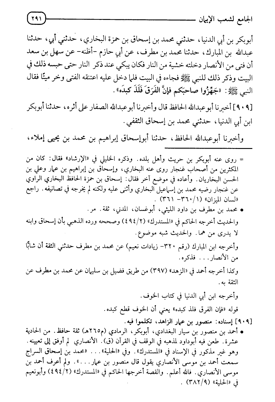 909 - أَخْبَرَنَا أَبُو عَبْدِ اللهِ الْحَافِظُ قَالَ: وَأَخْبَرَنَا أَبُو عَبْدِ اللهِ الصَّفَّارُ، عَلَى أَثَرِهِ، حَدَّثَنَا أَبُو بَكْرِ بْنُ أَبِي الدُّنْيَا، حَدَّثَنِي مُحَمَّدُ بْنُ إِسْحَاقَ الثَّقَفِيُّ، وَأَخْبَرَنَا أَبُو عَبْدِ اللهِ الْحَافِظُ، حَدَّثَنَا أَبُو إِسْحَاقَ إِبْرَاهِيمُ بْنُ مُحَمَّدِ بْنِ يَحْيَى إِمْلَاءً، -[292]- حَدَّثَنَا مُحَمَّدُ بْنُ إِسْحَاقَ الثَّقَفِيُّ أَبُو الْعَبَّاسِ، حَدَّثَنِي أَحْمَدُ بْنُ مَنْصُورٍ الْأَنْصَارِيُّ، عَنْ مَنْصُورِ بْنِ عَمَّارٍ قَالَ: حَجَجْتُ حَجَّةً فَنَزَلْتُ سِكَّةً مِنْ سِكَكِ الْكُوفَةِ فَخَرَجْتُ فِي لَيْلَةٍ مُظْلِمَةٍ فَإِذَا بِصَارِخٍ يَصْرُخُ فِي جَوْفِ اللَّيْلِ وَهُوَ يَقُولُ: §" إِلَهِي وَعِزَّتِكَ وَجَلَالِكَ مَا أَرَدْتُ بِمَعْصِيَتِي إِيَّاكَ مُخَالَفَتَكَ وَلَقَدْ عَصَيْتُكَ إِذْ عَصَيْتُكَ وَمَا أَنَا بِنَكَالِكَ عَاقِلٌ وَلَكِنْ خَطِيئَةٌ عَرَضَتْ أَعَانَنِي عَلَيْهَا شَقَائِي وَغَرَّنِي سِتْرُكَ الَمُرْخَى عَلَيَّ وَقَدْ عَصَيْتُكَ بِجَهْدِي، وَخَالَفْتُكَ بِجَهْلِي فَالْآنَ مِنْ عَذَابِكَ مَنْ يَسْتَنْقِذُنِي، وَبِحَبْلِ مَنَ أَتَّصِلُ إِذا أَنْتَ قَطَعْتَ حَبْلَكَ عَنِّي، وَاشَبَابَاهُ وَاشَبَابَاهُ فَلَمَّا فَرَغَ مِنْ قَوْلِهِ قَرَأْتُ آية مِنْ كِتَابِ اللهِ عَزَّ وَجَلَّ نَارًا وَقُودُهَا النَّاسُ وَالْحِجَارَةُ عَلَيْهَا مَلَائِكَةٌ غِلَاظٌ شِدَادٌ الْآيَةَ فَسَمِعْتُ حَرَكَةً شَدِيدَةً لَمْ أَسْمَعْ بَعْدَهَا حِسًّا فَمَضَيْتُ فَلَمَّا كَانَ الْغَدُ رَجَعْتُ فِي مَدْرَجَتِي فَإِذَا أَنَا بِجِنَازَةٍ قَدْ وُضِعَتْ، وَإِذَا عَجُوزٌ كَبِيرَةٌ فَسَأَلْتُهَا عَنْ أَمْرِ الْمَيِّتِ وَلَمْ تَكُنْ عَرَفَتْنِي فَقَالَتْ: مَرَّ هَهُنَا رَجُلٌ لَا جَزَاهُ اللهُ إِلَّا جَزَاءَهُ مَرَّ بِابْنِي الْبَارِحَةَ وَهُوَ قَائِمٌ يُصَلِّي فَتَلَا آيَةً مِنْ كِتَابِ اللهِ فَلَمَّا سَمِعَهَا ابْنِي تَقَطَّعَتْ مَرَارَتُهُ فَوَقَعَ مَيِّتًا "